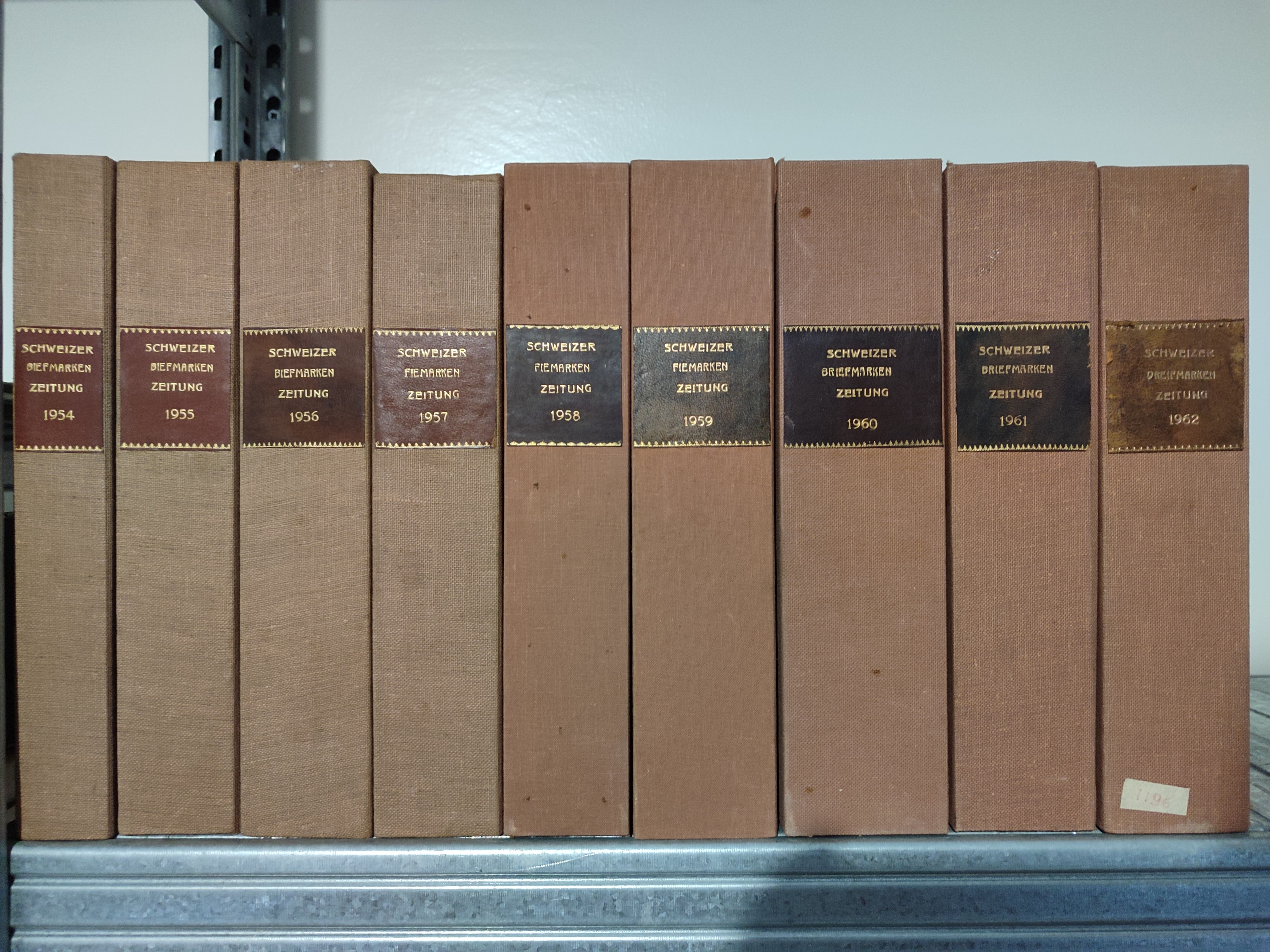 1954 - Importante rivista Svizzera ''Schweizer Briefmarken Zeitung'', collezione dal 1954 al 1962 conservata in cofanetti d'epoca.