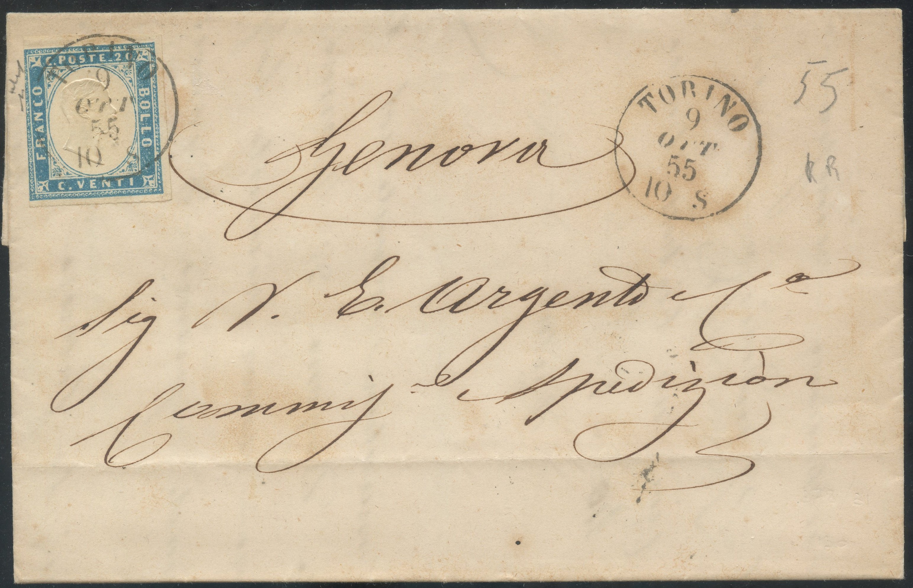 09.10.1855 - Lettera da Torino per Genova affrancata tramite un 20 cent. cobalto chiaro n. 15a. Raro uso nell' Ottobre del 1855. Cat. 3.000. (A-) (Chiavarello)