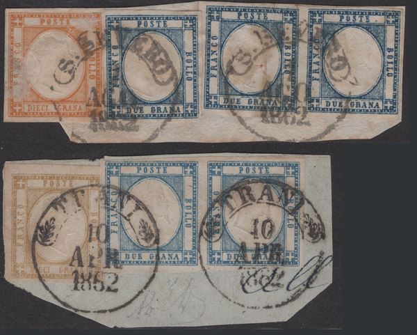 1859 - 2grana azzurro carta di palermo n.6i con evidente doppia stampa a sinistra e ritocco 81. Insieme di grande rarità, probabilmente unico. (A-) (Emilio Diena)