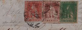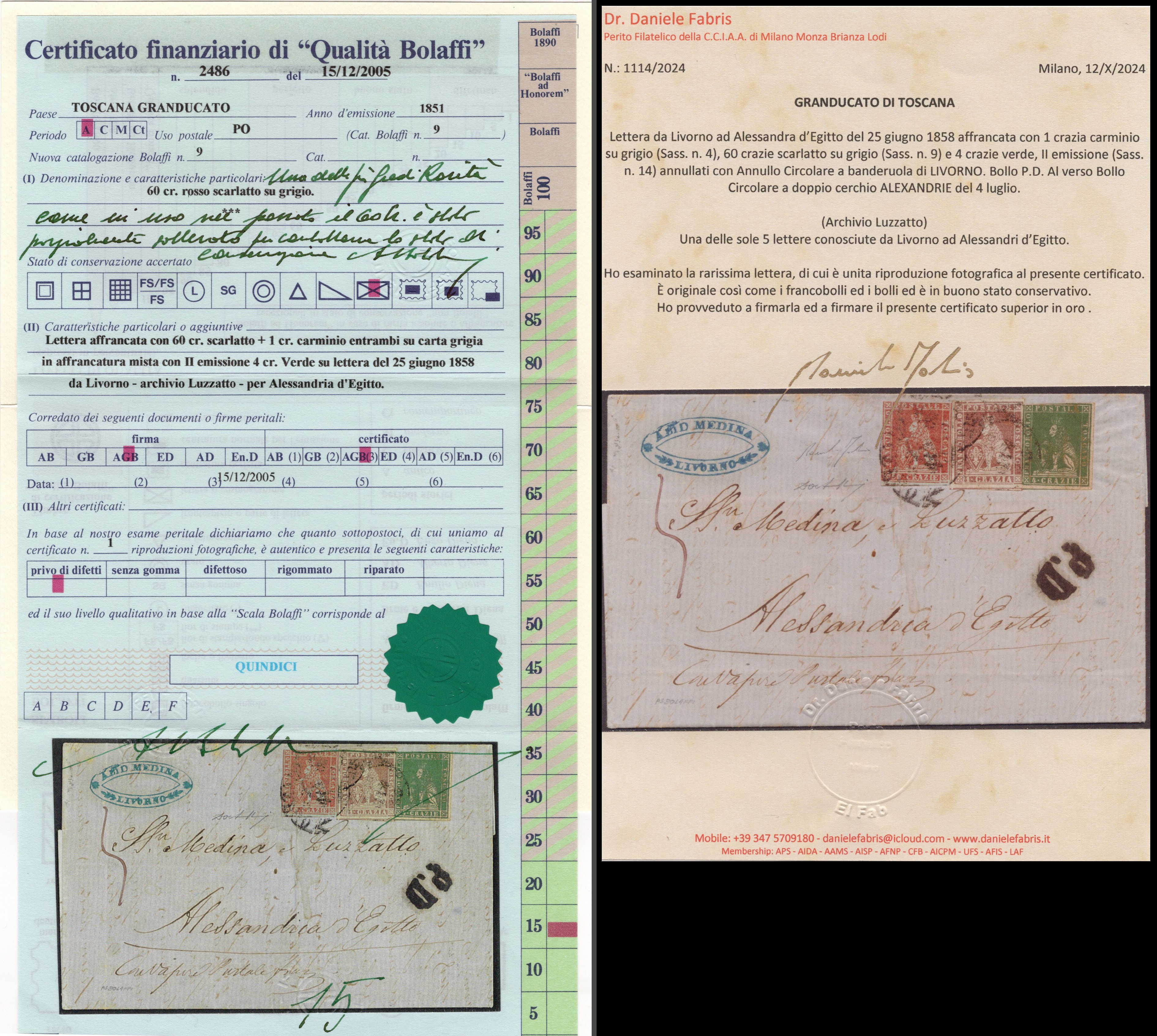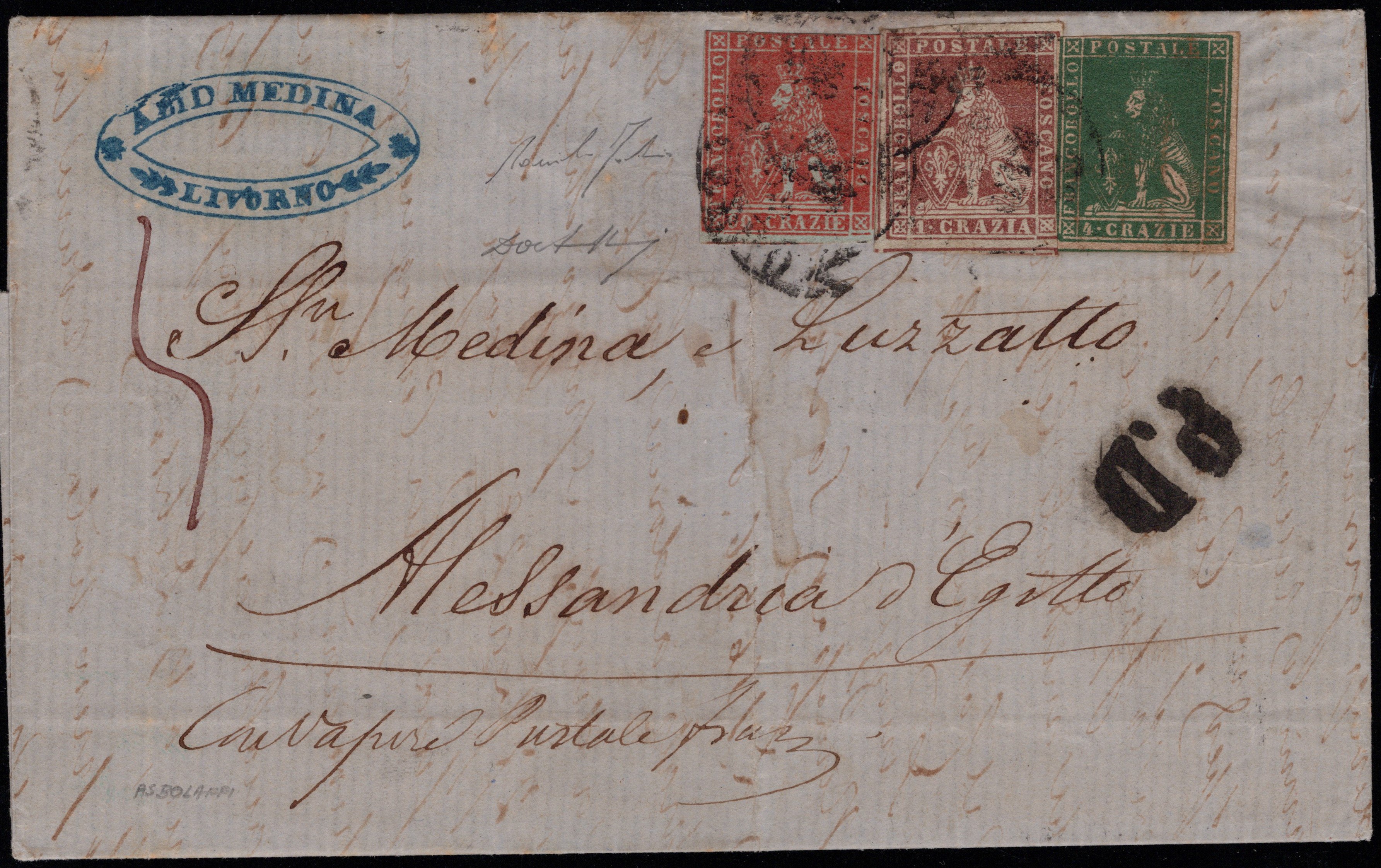 1853 - Lettera da Livorno per Alessandria D'Egitto per 65 crazie tramite un 60cr. con tre grandi margini e stretto in alto + 1cr. + 4cr. Lettera elencata sul Sassone tra le 5 note con tale affrancatura. L'insieme รจ impreziosito dal DC ''OVETTO'' presente sul 60cr. che rende l'insieme unico. Cat.325.000 euro ++. (A-) (Certificato finanziario Bolaffi, Certificato D. Fabris)