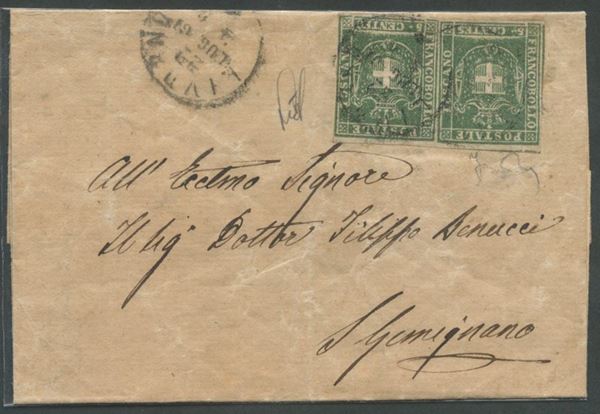 02.12.1859 - 1 crazia con filigrana a linee ondulate n.12, tre esemplari su lettera completa di testo partita da Firenze in pieno Governo Provvisorio (28 Aprile 1858/1 Gennaio 1860) e giunta a Modena il 08.12.1859. Notati interessanti DC su ogni valore. Insieme di grande pregio. Cat. 27.000. (A+/A-) (Emilio Diena)