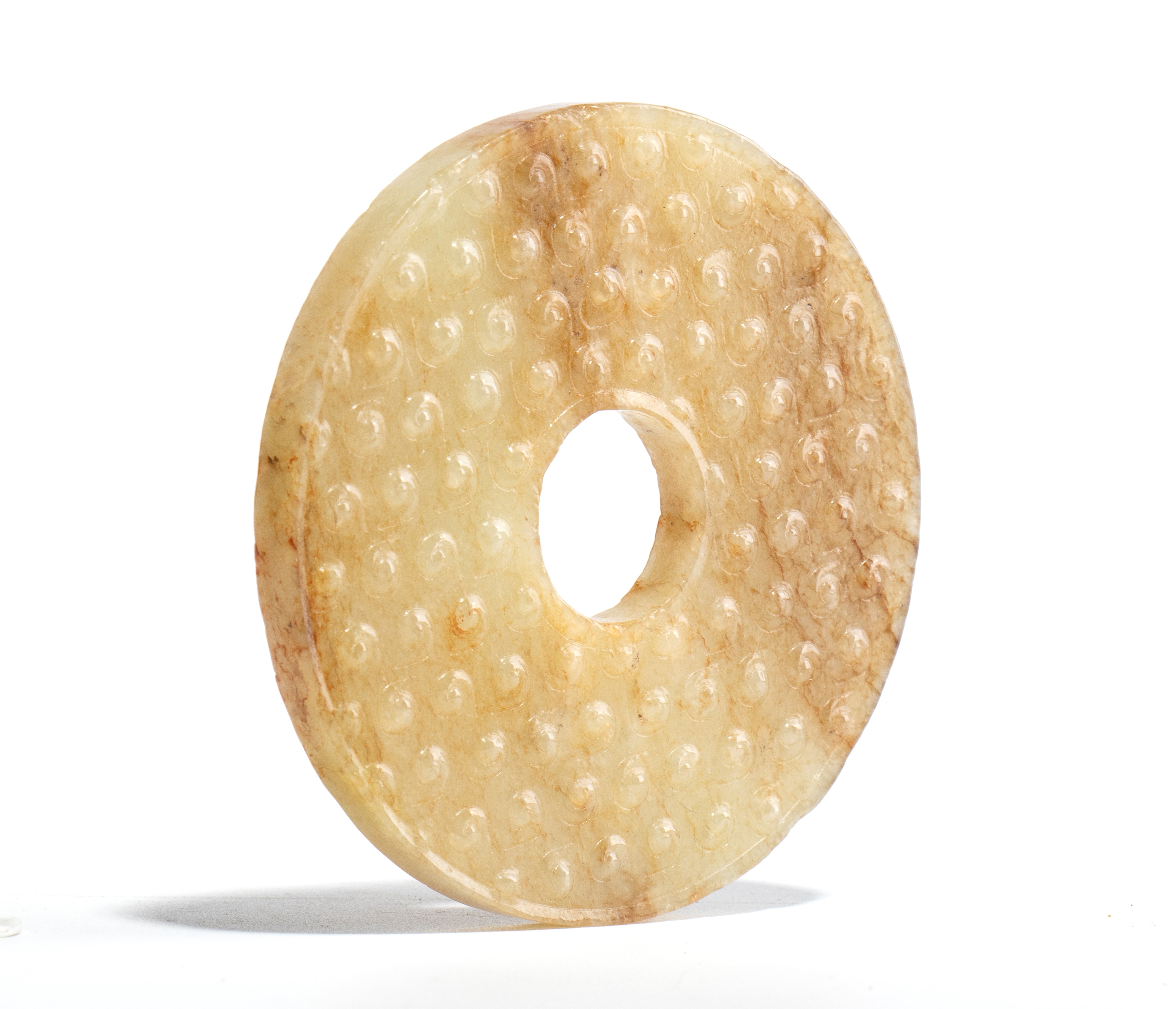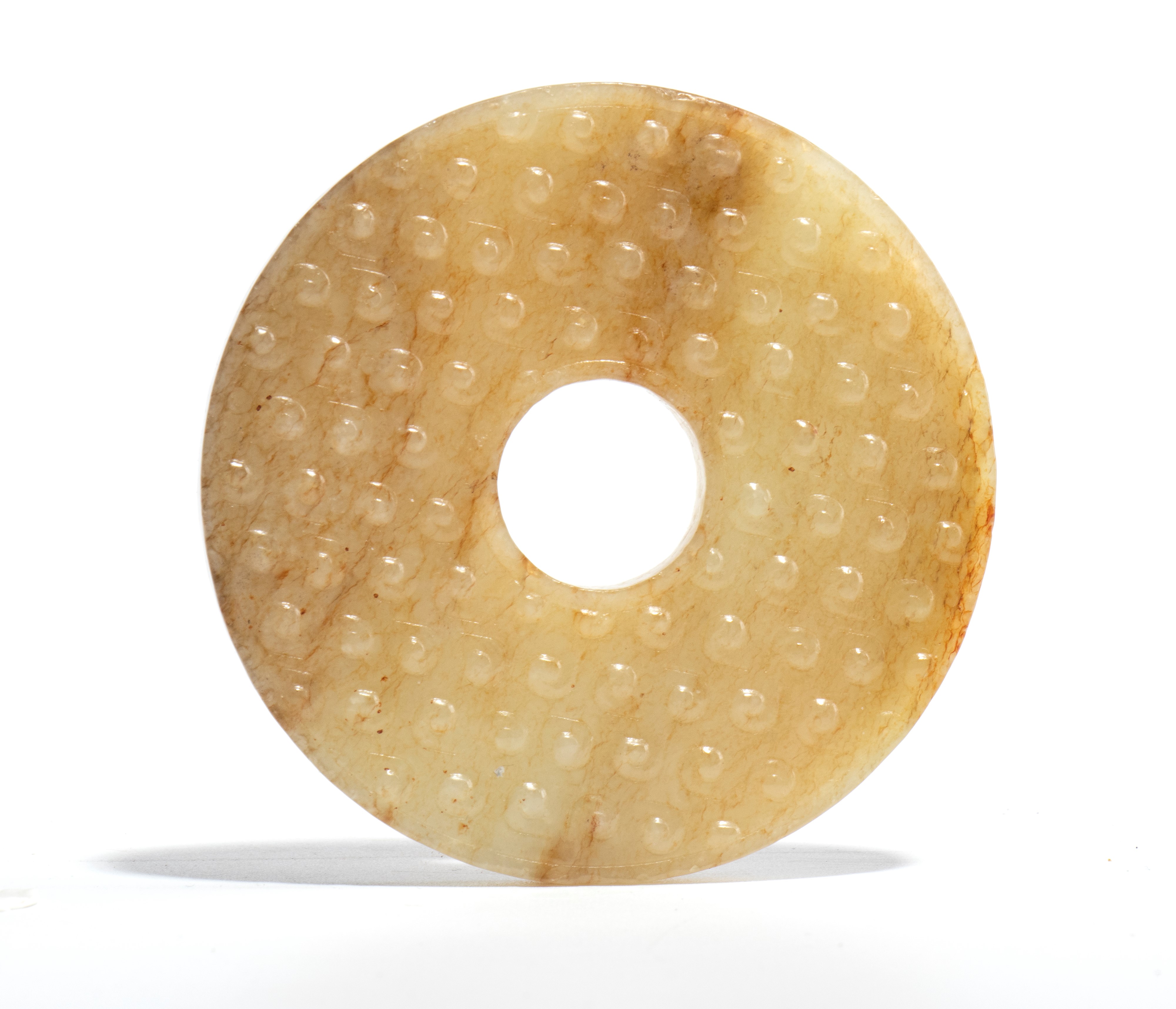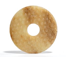 Beautiful yellow jade Bi disc with light relief on both sides with elegant geometric decoration in the style of the Han Dynasty (206 AD-220 AD).