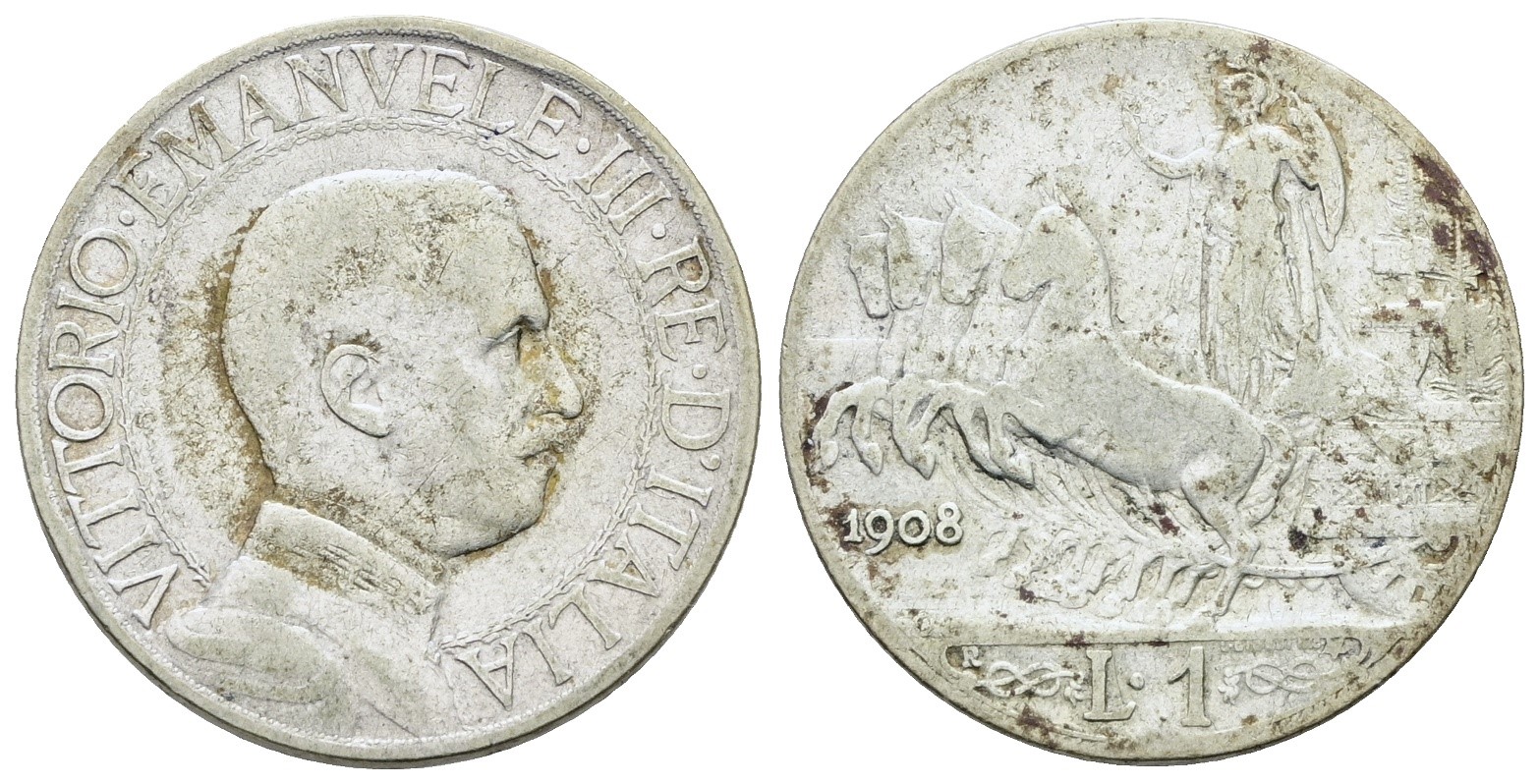 REGNO D'ITALIA. Vittorio Emanuele III (1900-1943). 1 lira 1908 "Quadriga veloce". Ag; 5gr; Gig.132; NC; MB+