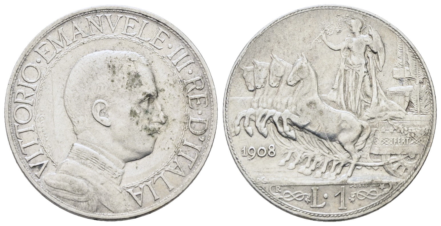 REGNO D'ITALIA. Vittorio Emanuele III (1900-1943). 1 lira 1908 "Quadriga veloce". Ag; Gig. 132; NC; BB