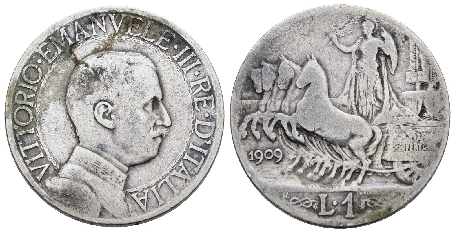 REGNO D'ITALIA. Vittorio Emanuele III (1900-1943). 1 lira 1909 "Quadriga veloce". Ag; Gig. 133; NC; MB