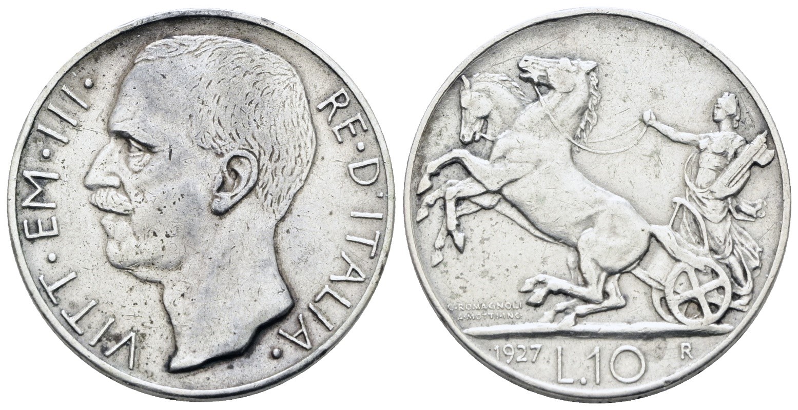REGNO D'ITALIA. Vittorio Emanuele III (1900-1943). 10 lire 1927 "Biga"**. Ag; 10gr; Gig.56a; BB+