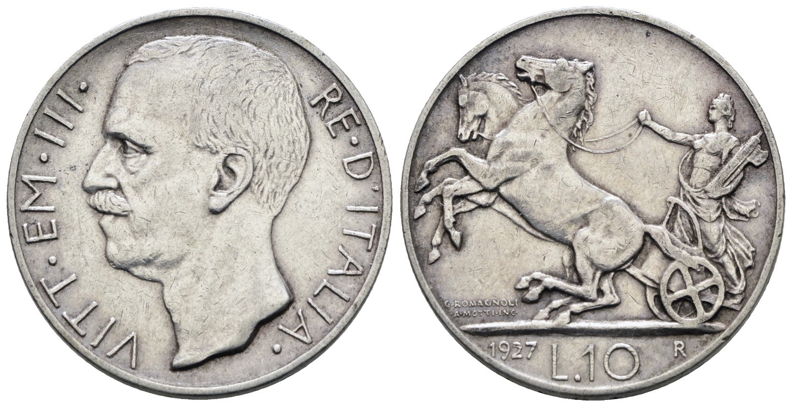 REGNO D'ITALIA. Vittorio Emanuele III (1900-1943). 10 lire 1927 "Biga"**. Ag; 10gr; Gig.56a; BB