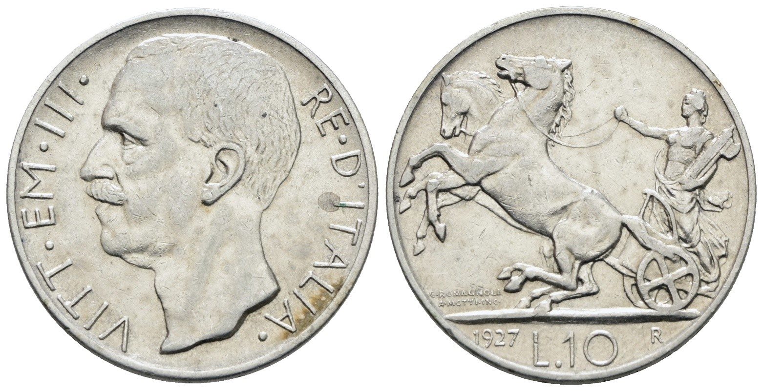 REGNO D'ITALIA. Vittorio Emanuele III (1900-1943). 10 lire 1927 "Biga"**. Ag; 10gr; Gig.56a; BB+