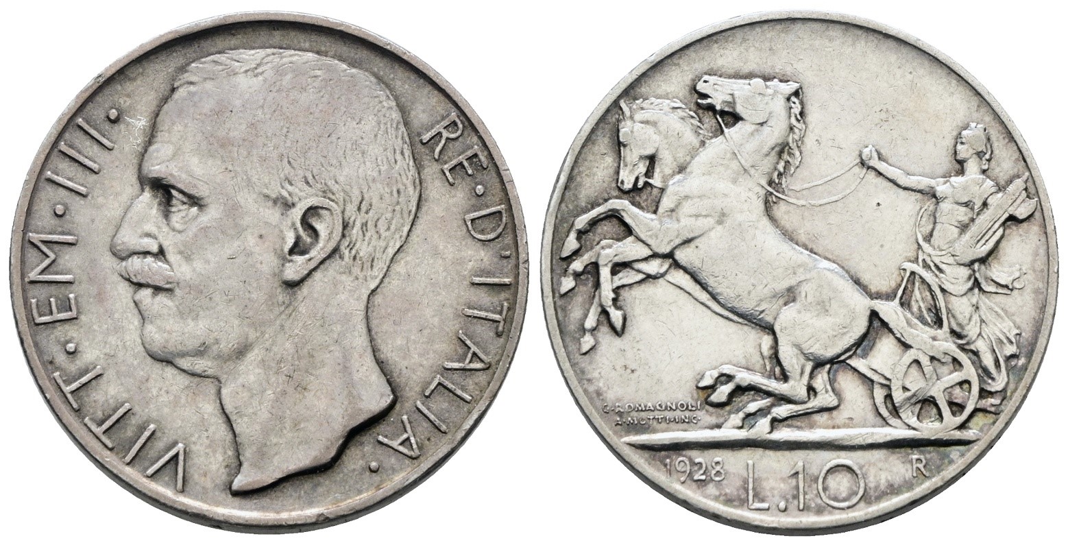 REGNO D'ITALIA. Vittorio Emanuele III (1900-1943). 10 lire 1928 "Biga"*. Ag; 10gr; Gig.57; NC; BB