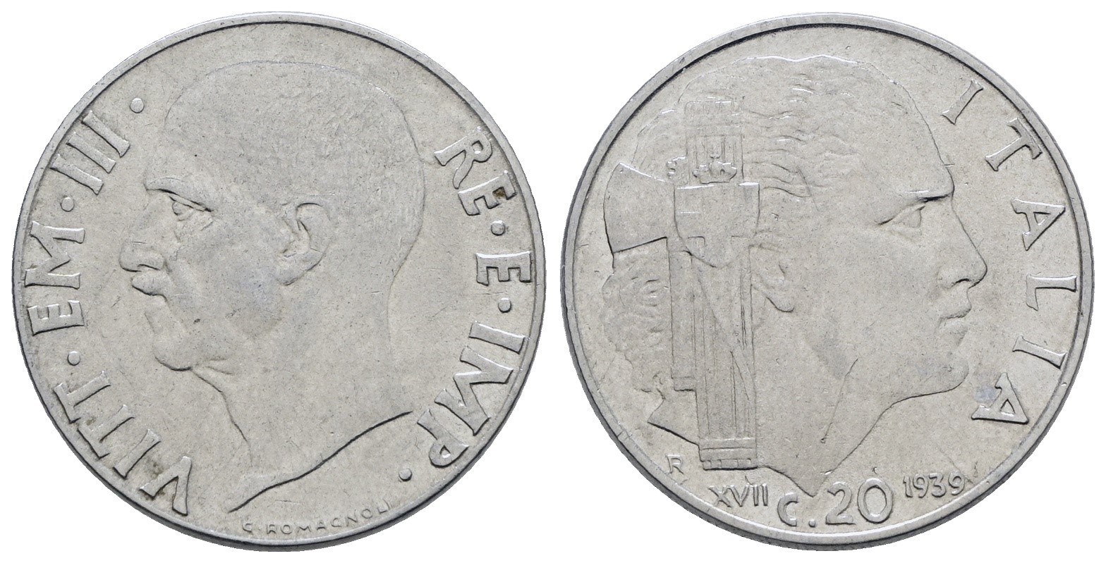 REGNO D'ITALIA. Vittorio Emanuele III (1900-1943). 20 centesimi 1939 XVII "Impero". Ac; 4gr; Gig. 218; SPL/FDC