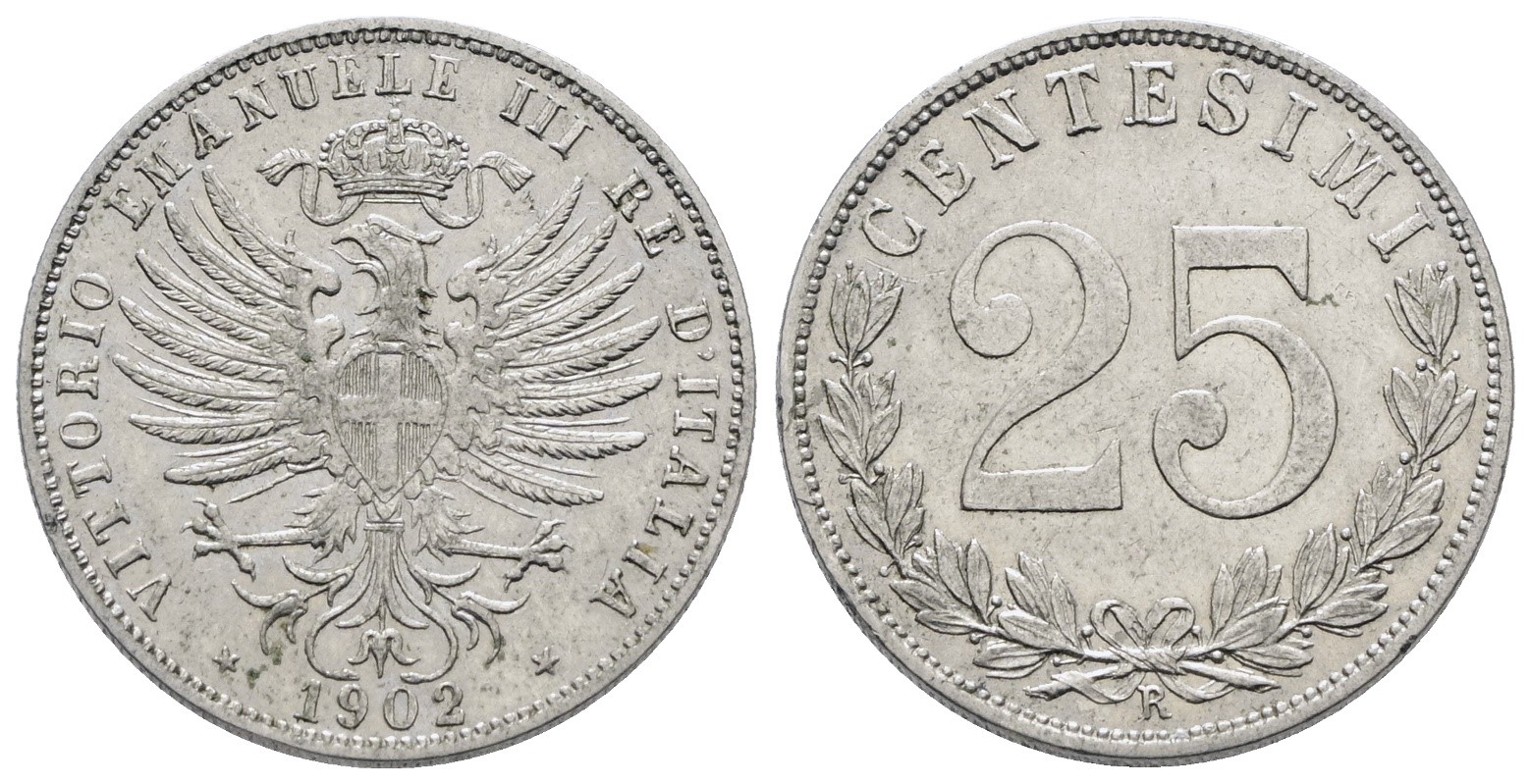 REGNO D'ITALIA. Vittorio Emanuele III (1900-1943). 25 centesimi 1902. Ni; 4gr; Gig. 191; Raro; BB/SPL