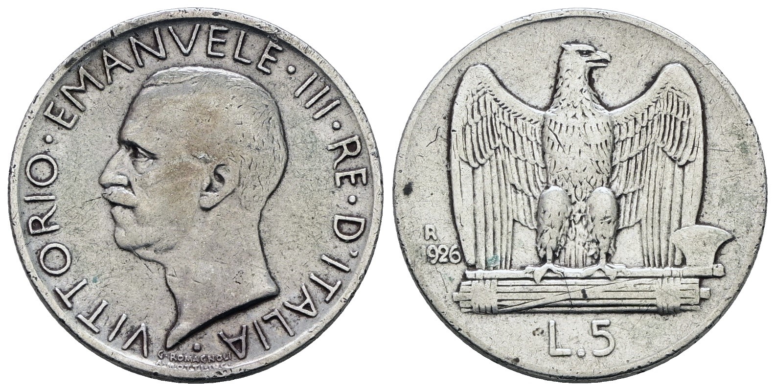 REGNO D'ITALIA. Vittorio Emanuele III (1900-1943). 5 lire 1926 "Aquilotto". Ag; 5gr; Gig.73; Raro; MB/BB