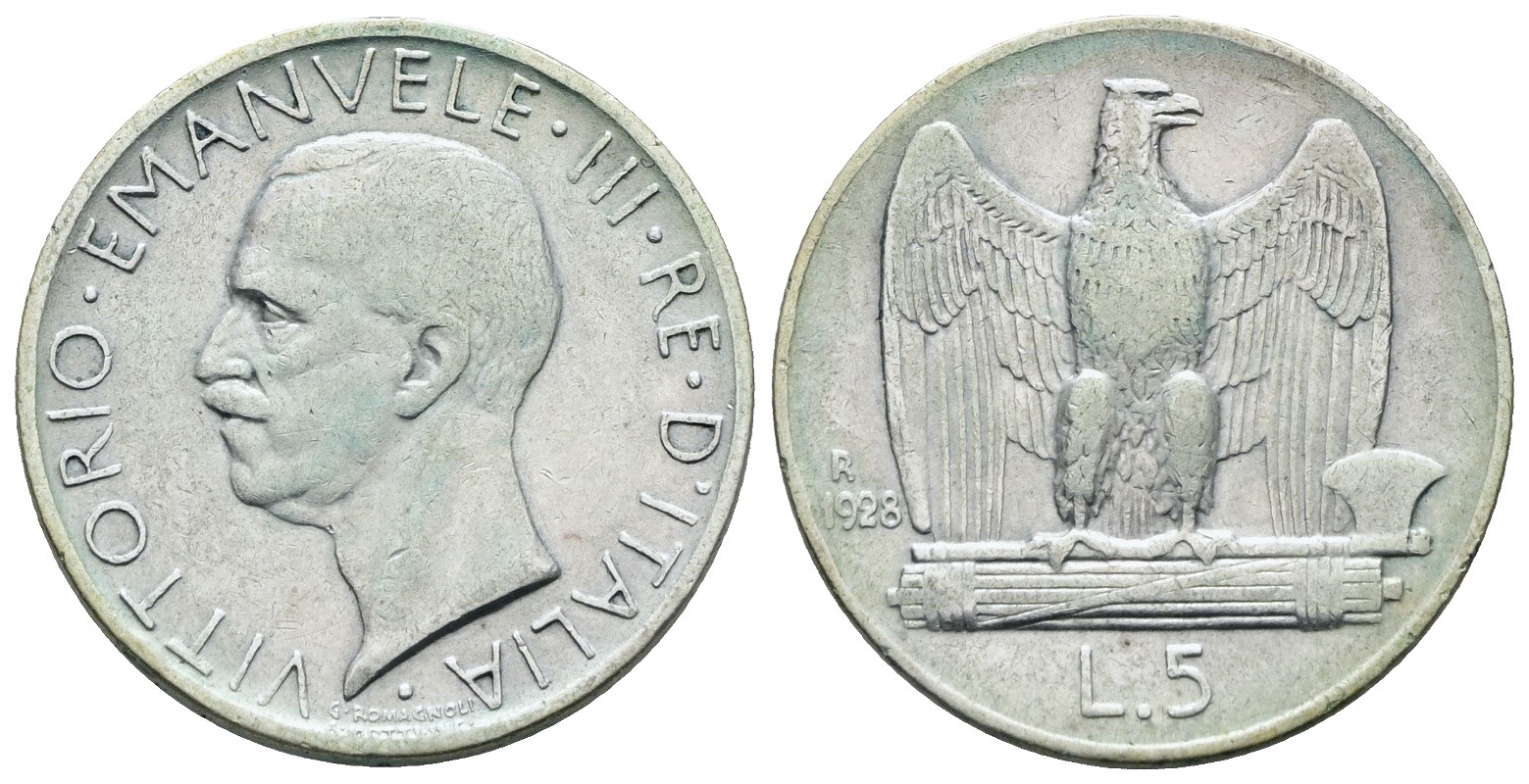 REGNO D'ITALIA. Vittorio Emanuele III (1900-1943). 5 lire 1928 "Aquilotto"**. Ag; 5gr; Gig. 75a; Raro. BB