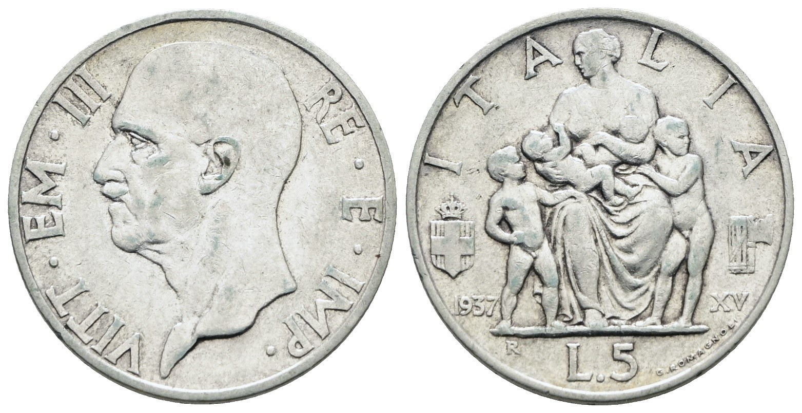 REGNO D'ITALIA. Vittorio Emanuele III (1900-1943). 5 lire 1937 "Famiglia". Ag; 5gr; Gig. 84; Raro; BB