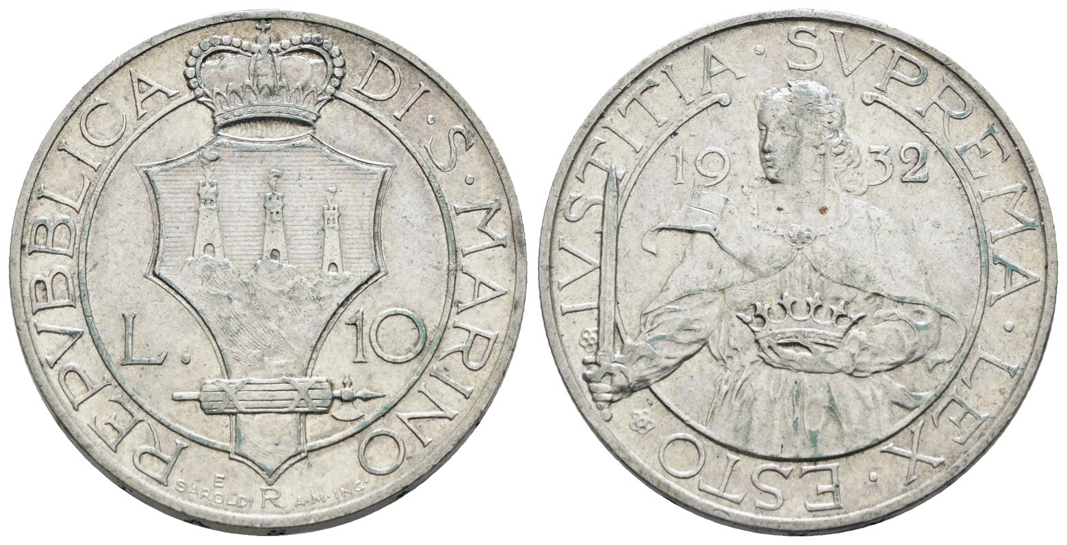 SAN MARINO. Vecchia monetazione (1864-1938). 10 lire 1932. Ag; 10gr; Gig.11; BB/SPL
