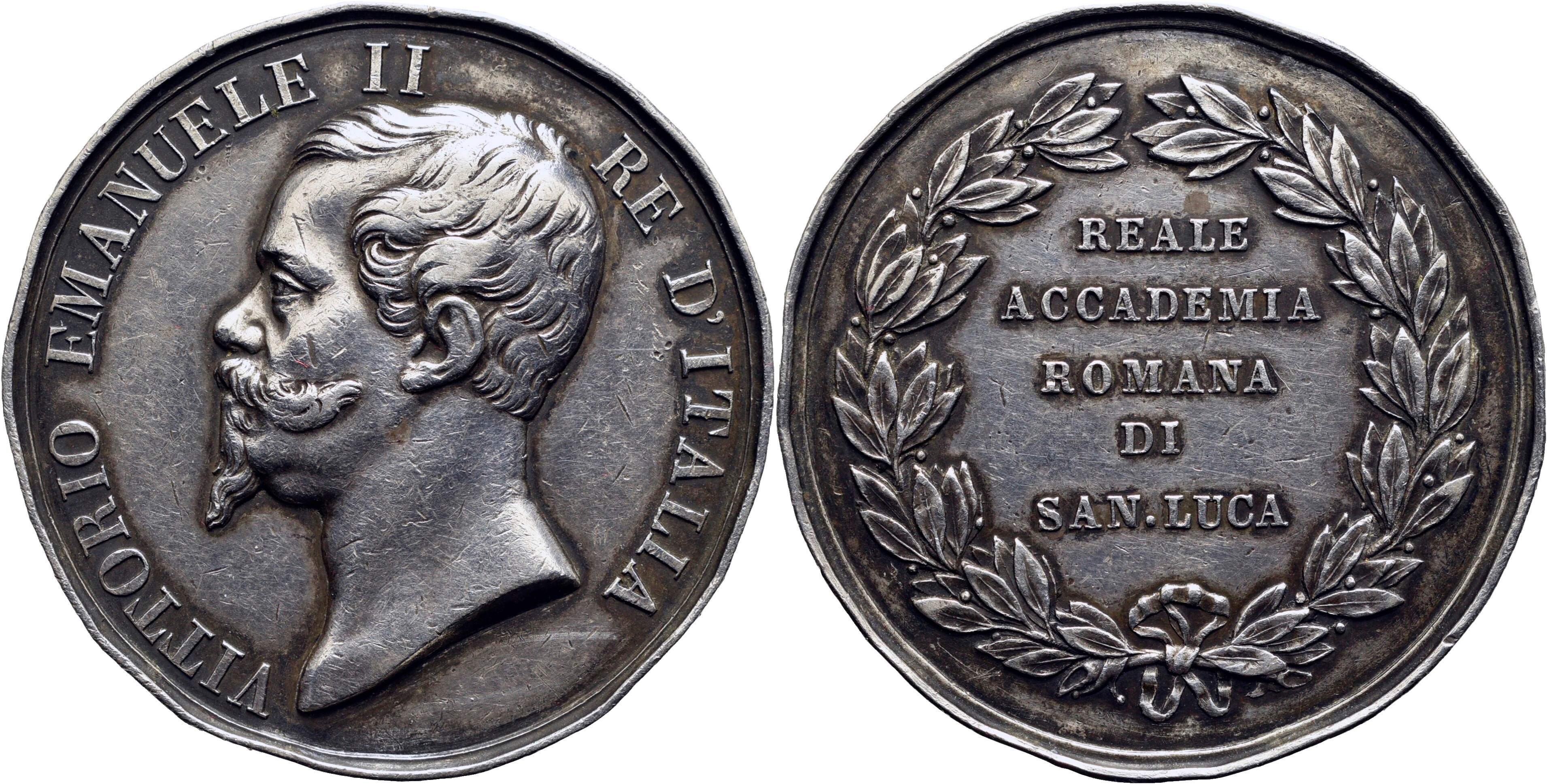 SAVOIA - V.Emanuele II Medaglia Reale Accademia Romana di San Luca. 45 mm. AG g. 33,17 RRR Senza rosetta. Colpi. BB