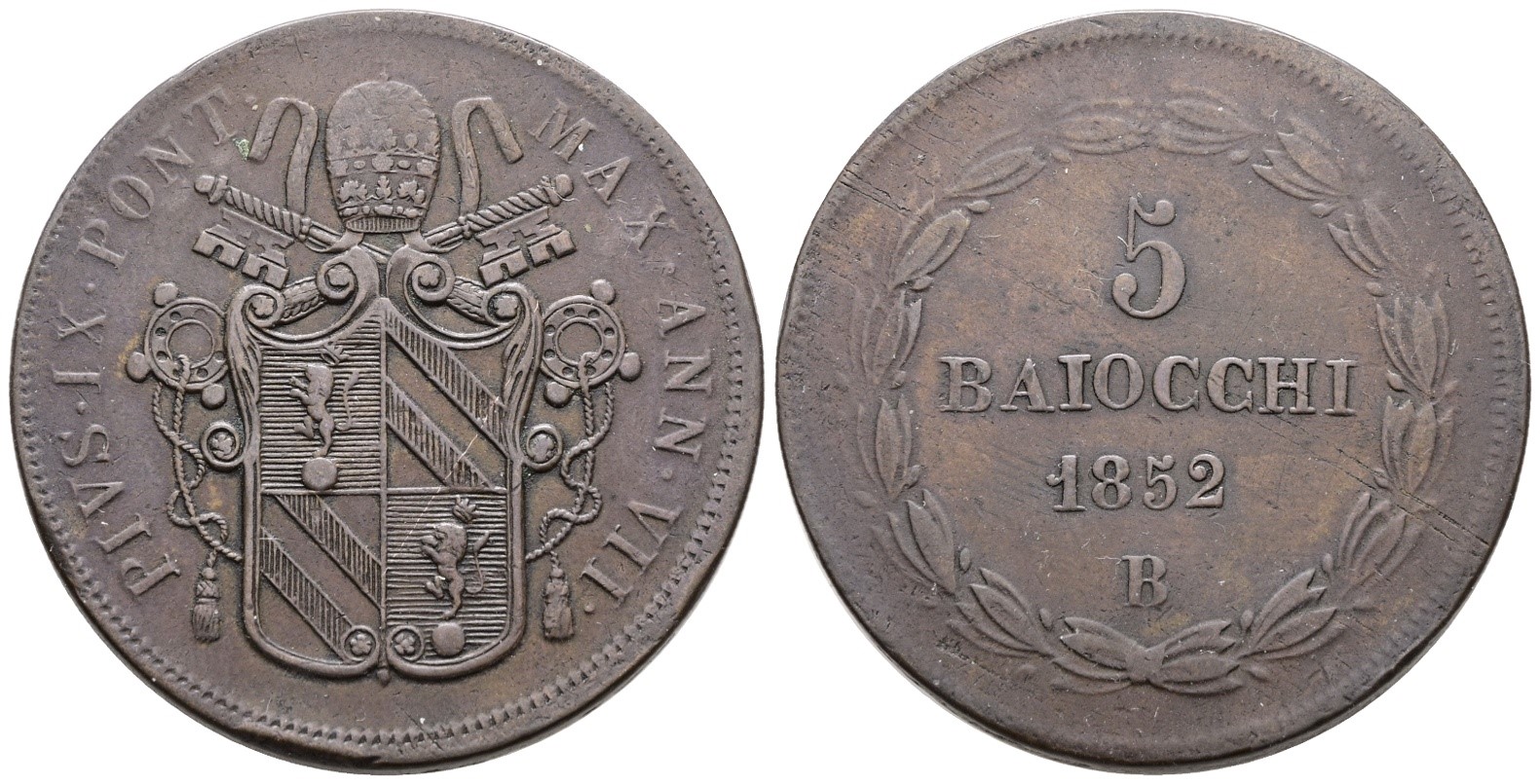 STATO PONTIFICIO. BOLOGNA. Pio IX (1846-1870). 5 baiocchi 1852 anno VII. Cu; 42gr; Gig.181; BB+