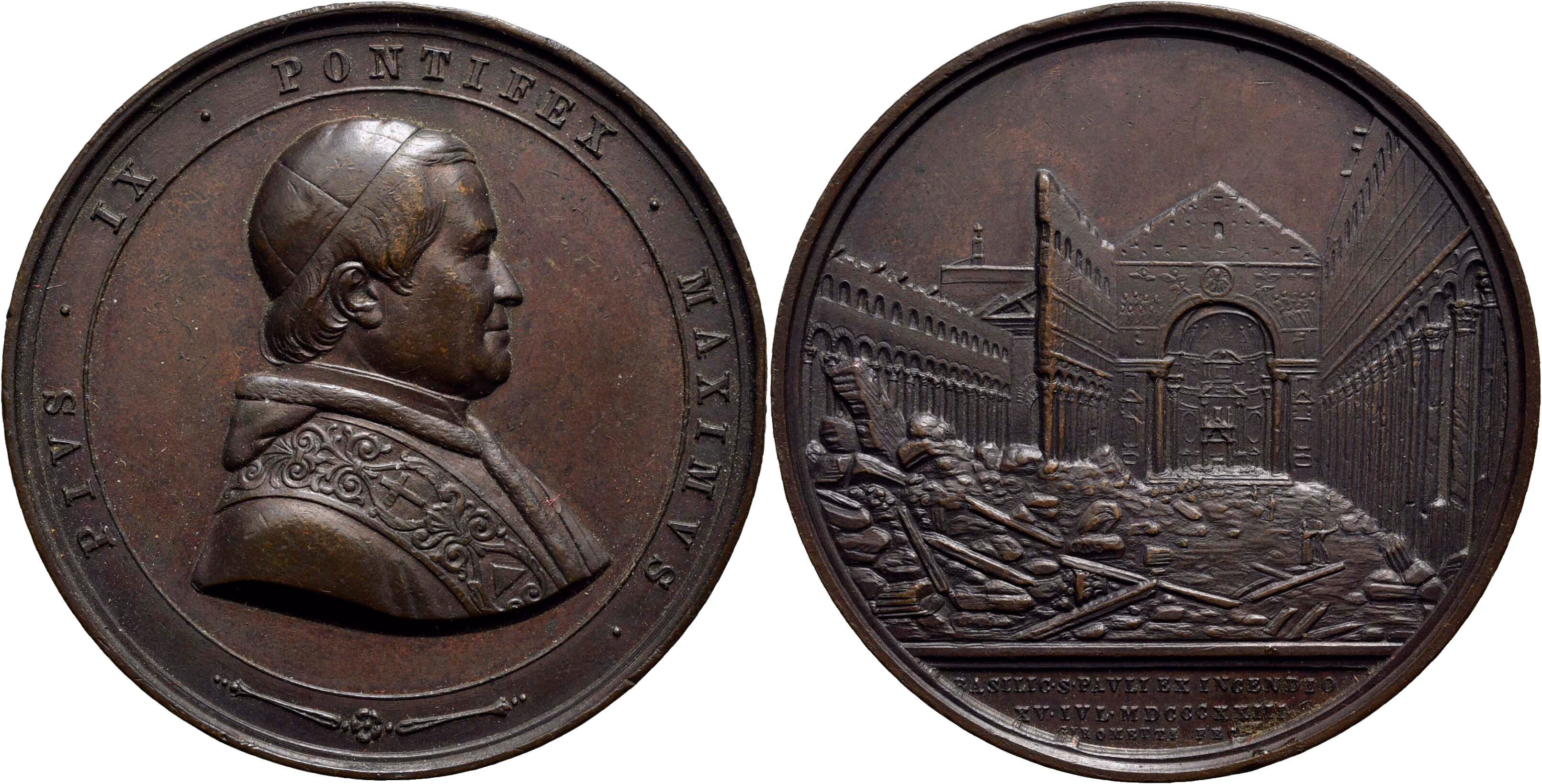 STATO PONTIFICIO. Pio IX (1846-1878). Medaglia 1823 Incendio basilica S.Paolo 50 mm. AE 66g.R SPL-FDC