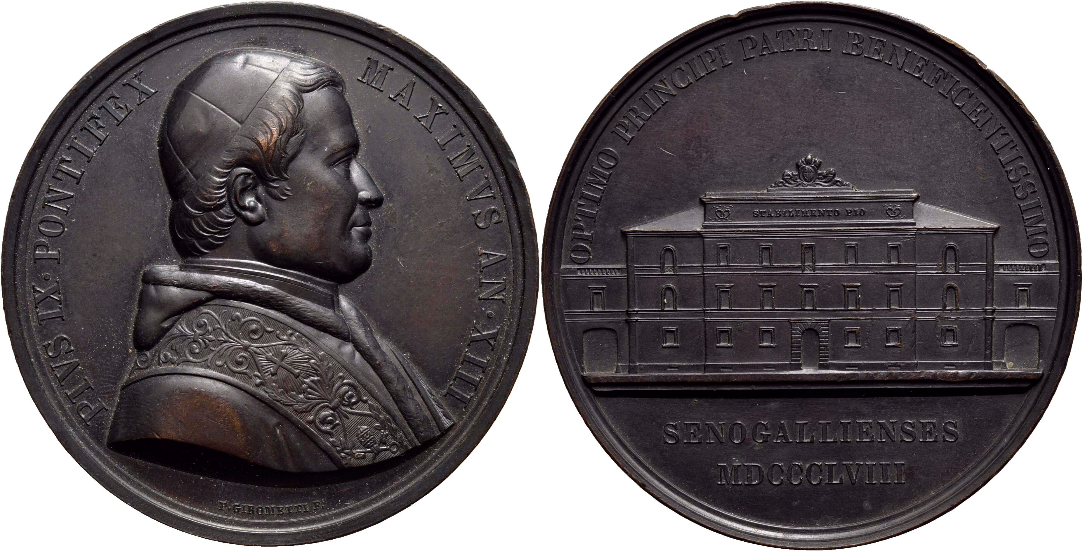 STATO PONTIFICIO. Pio IX (1846-1878). Medaglia 1858 A. XIII Stabilimento Pio a Senigallia ร: 59 mm. (AE g. 85) RR. qFDC