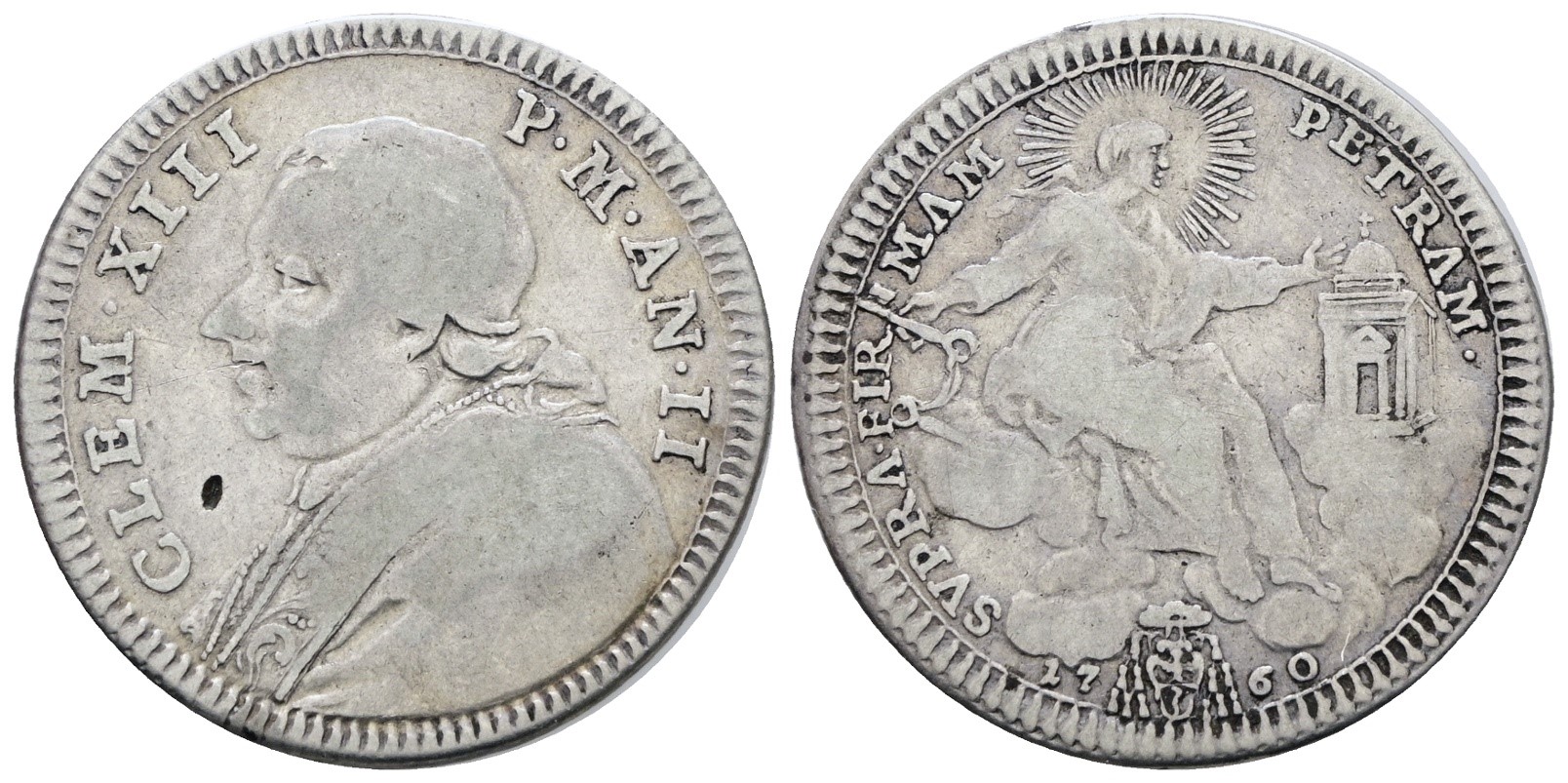STATO PONTIFICIO. ROMA. Clemente XIII (1758-1769). Doppio giulio, quinto di scudo 1760, anno II. Ag; 5gr; Munt.18; MIR 2711/2; RR; Q.BB