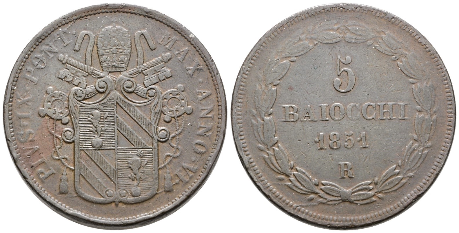 STATO PONTIFICIO. ROMA. Pio IX (1846-1870). 5 baiocchi 1851 anno VI. Cu; 42gr; Gig.176; BB+