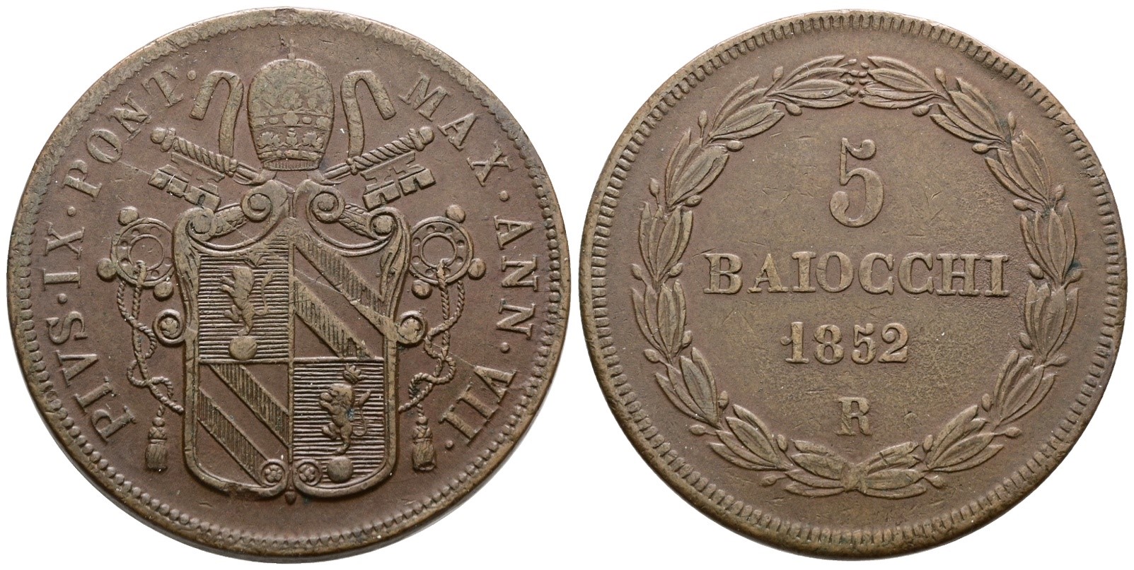 STATO PONTIFICIO. ROMA. Pio IX (1846-1870). 5 baiocchi 1852 anno VII. Cu; 42gr; Gig.180; BB/SPL