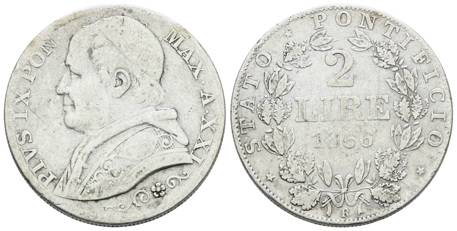 STATO PONTIFICIO. ROMA. Pio IX(1846-1870). 2 lire 1866 anno XXI, busto grande. Ag; 10gr; Gig.286bis; Raro; Q.BB