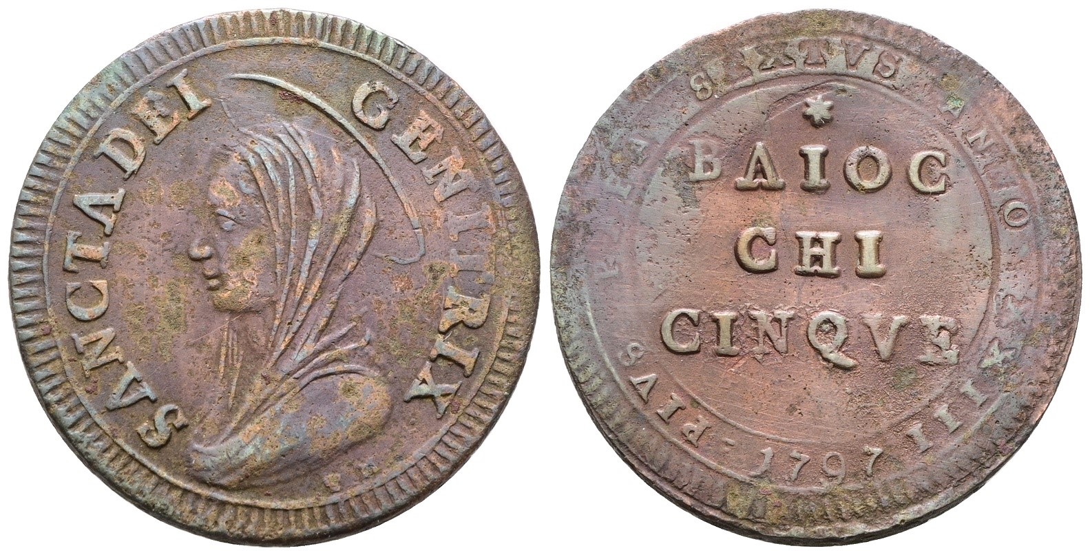 STATO PONTIFICIO. ROMA. Pio VI (1775-1799). Madonnina da 5 baiocchi 1797. Cu; 16,9gr; Munt.94; MIR 2798/1; BB/SPL
