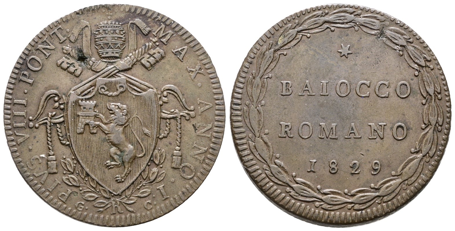 STATO PONTIFICIO. ROMA. Pio VIII (1829-1830). Baiocco 1829. Cu; 12,5gr; Raro; Gig.4; Q.SPL