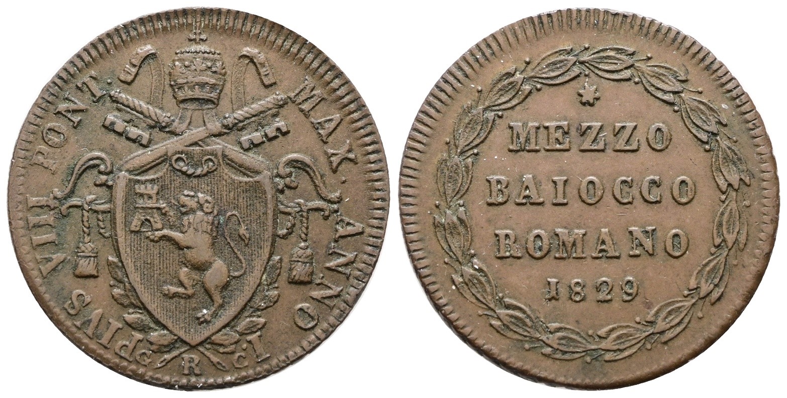 STATO PONTIFICIO. ROMA. Pio VIII (1829-1830). Mezzo Baiocco 1829. Cu; 6,59gr; Gig.5; Raro; SPL