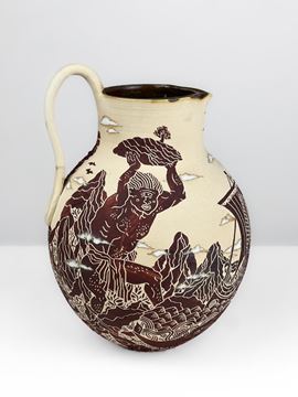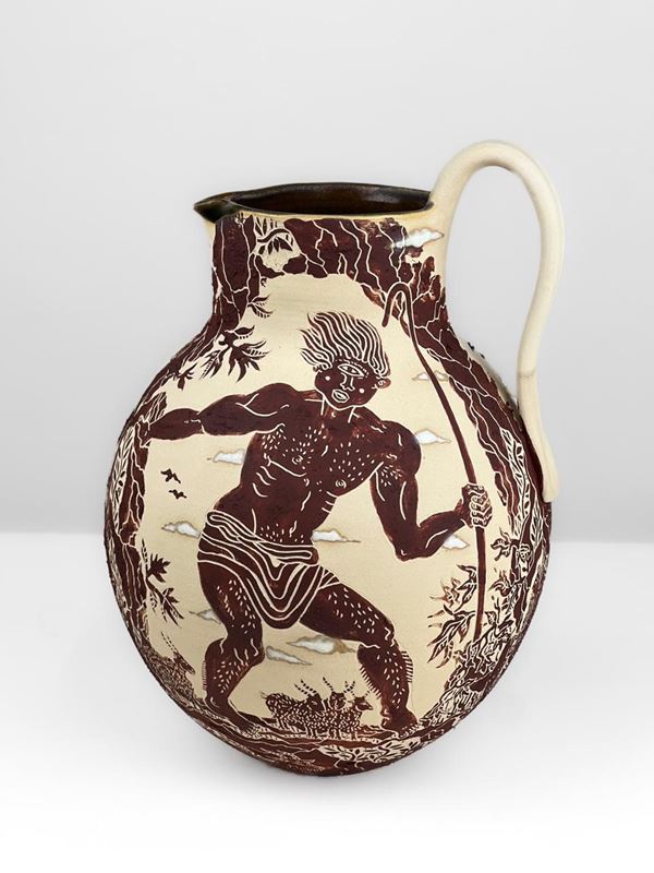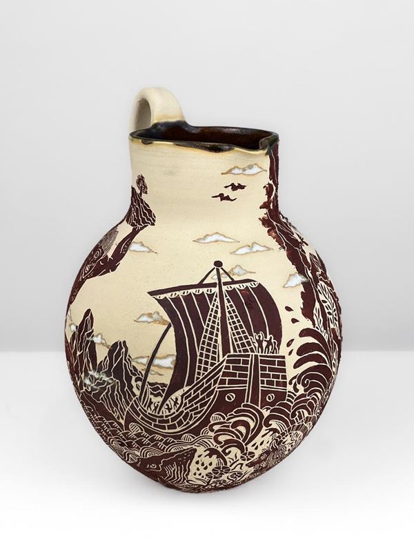 The exterior surface is decorated with wild clay and basalt collected in Sicily, materials that give the piece a dark, lava-like chromatic range, deeply connected to the island’s landscape and its mythic dimension. The interior is glazed, making the jug functional and creating a striking contrast between the rough, narrative quality of the exterior and the smooth inner surface