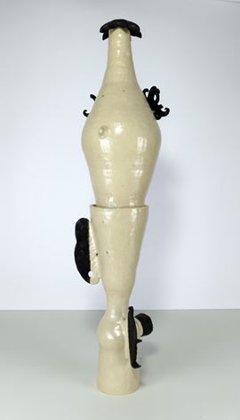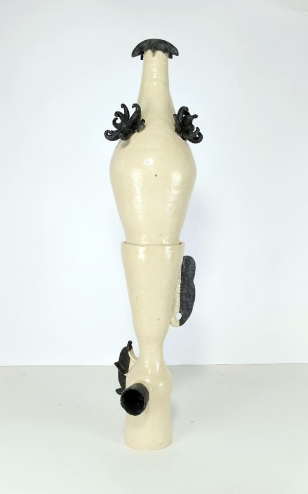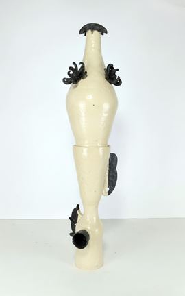 The work, created using the coil-building technique, consists of two interlocking pieces. It is part of a series by the artist featuring organic elements—such as eyelashes, tentacles, ears, and fins—in abstract form. The piece is made of white chamotte stoneware, finished with a semi-matte white glaze and a black glaze based on iron, nickel, and cobalt oxides, which give the surface a smooth, matte appearance. The glazes are made by the artist and are not commercially available.