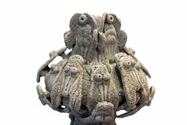 Fly Vessel is a work inspired by Gothic architecture and the terminal pinnacles of sacred buildings and representative palaces. The “flies,” abstract elements within the piece, symbolically reference the bees of Palazzo Barberini, merging historical references with contemporary imagination. The work is created using the coil-building technique; the flies are then applied with slip — a fluid suspension of clay used as a ceramic binder — resulting in a three-dimensional structure that produces a refined interplay of reliefs, interlocking forms, and contrasts of light and shadow. The glaze is made from a mixture of two lava glazes and copper oxide, an original formulation by the artist that is not commercially available.