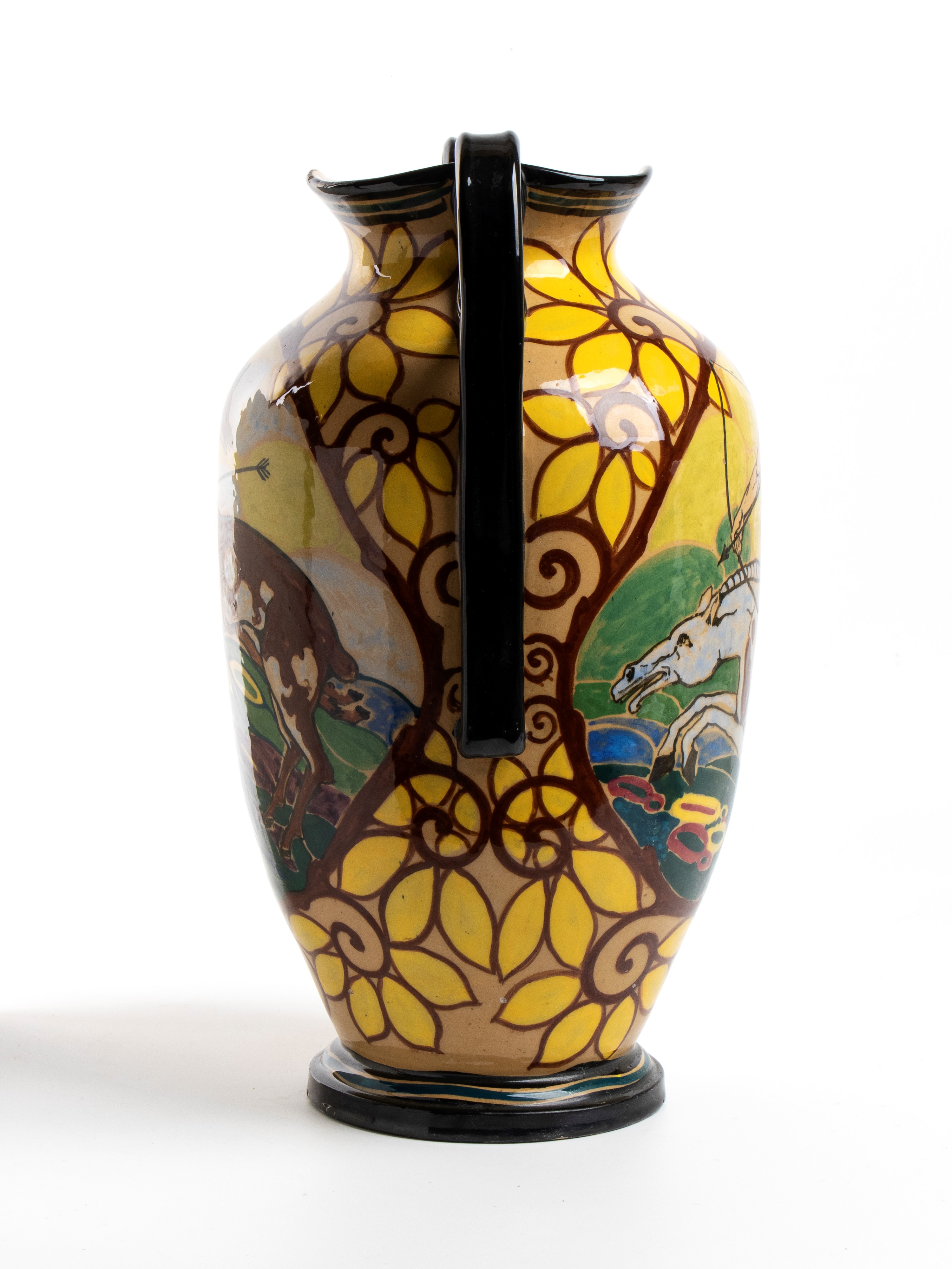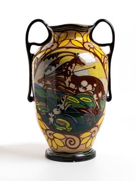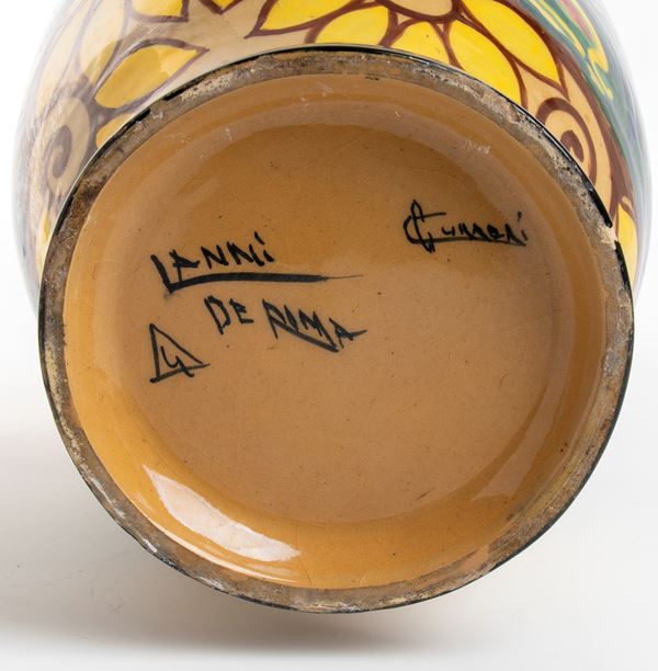 Two-handled vase of globular form with a modulated neck. Decorated with a nude man armed with a bow on a piebald horse and a wounded deer. Signed beneath the base: C. Gurreri, Lanni de Roma, with the โ€œGโ€ symbol
