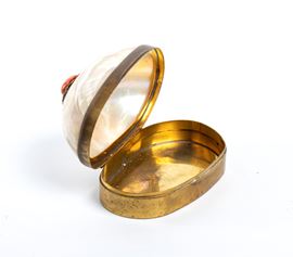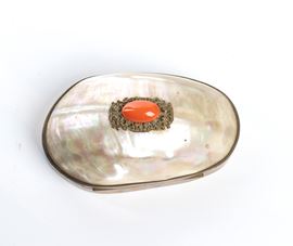oval shaped in gilded metal, with a hinged opening. The entire lid is made of mother-of-pearl and a cabochon coral is applied to the top.