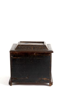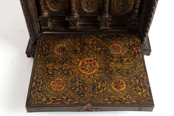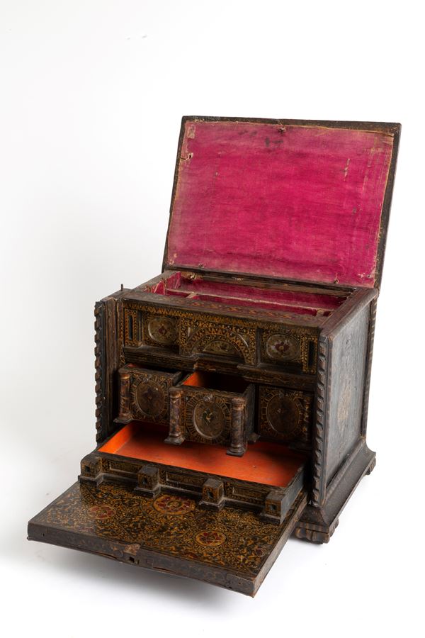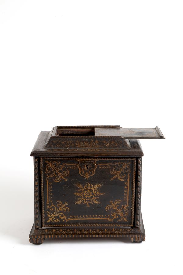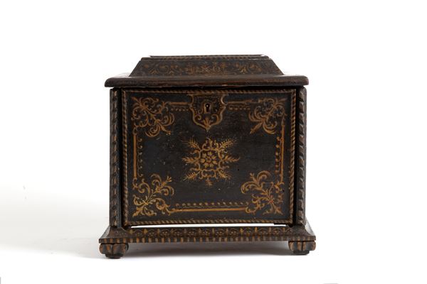 Finely lacquered and gilded with drop mouldings, painted mother-of-pearl plaques and faux marble columns. It has four drawers on the front, an opening lid with a secret compartment and compartments inside.