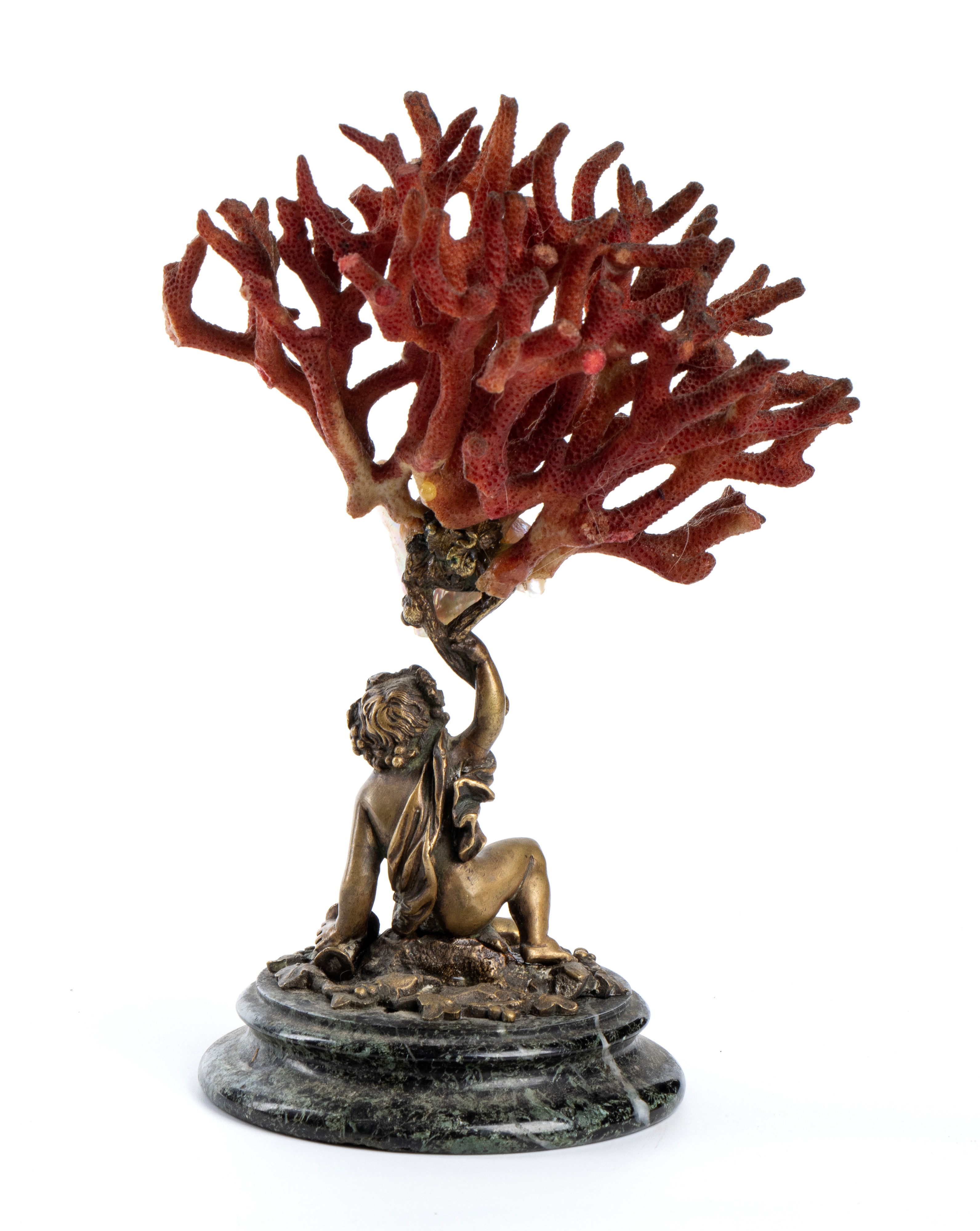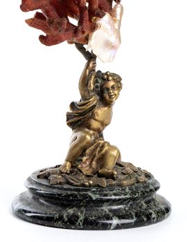 formed by a circular dark green marble base that supports a modelled gilded bronze cherub. The figure, seated with one leg bent and the other stretched out, turns its head slightly upwards; its right arm is raised to hold a branch of Mediterranean red coral (Corallium Rubrum) on which a large baroque pearl is mounted, used as a connecting element between the cherub and the coral.