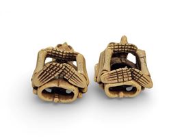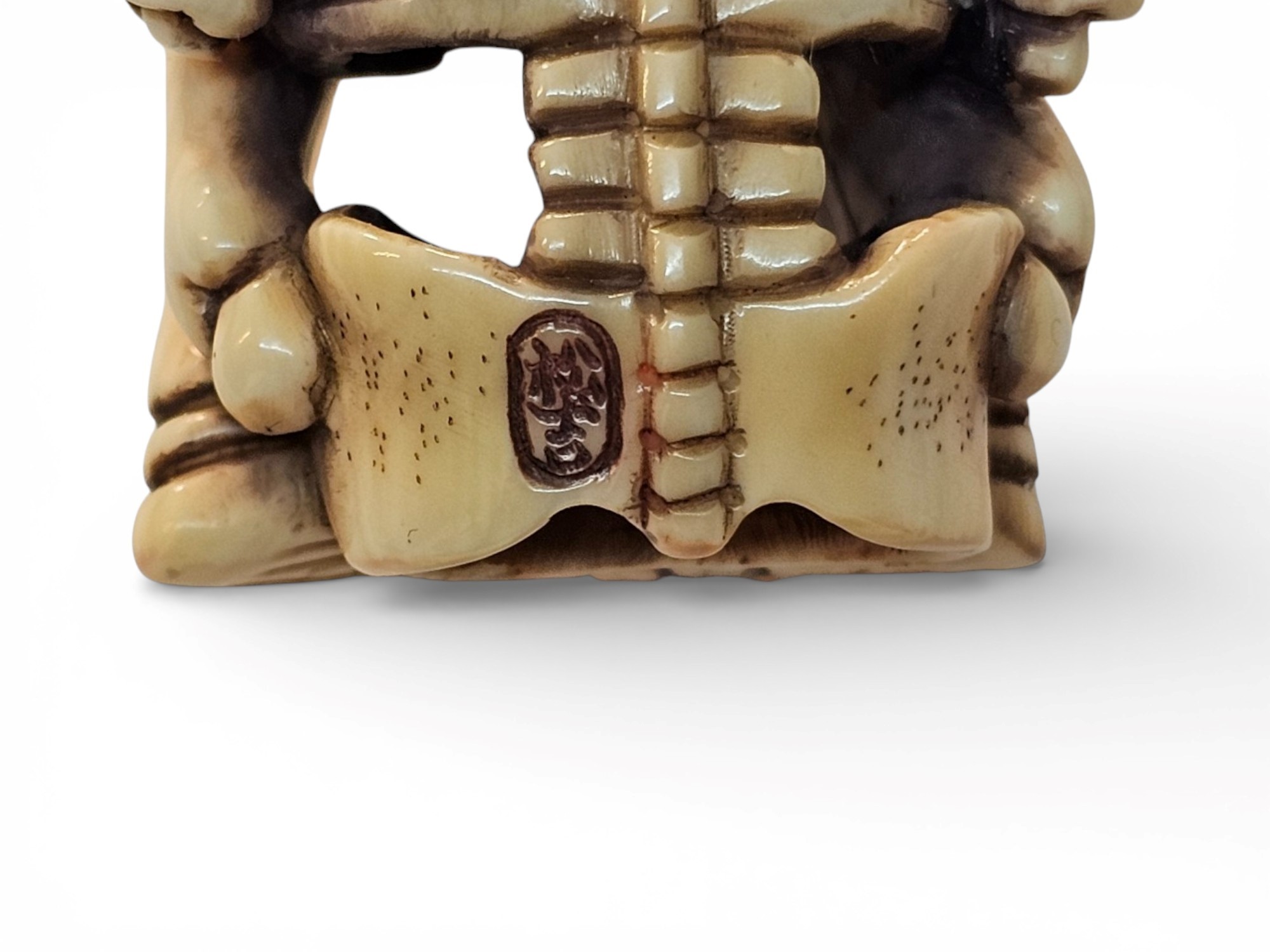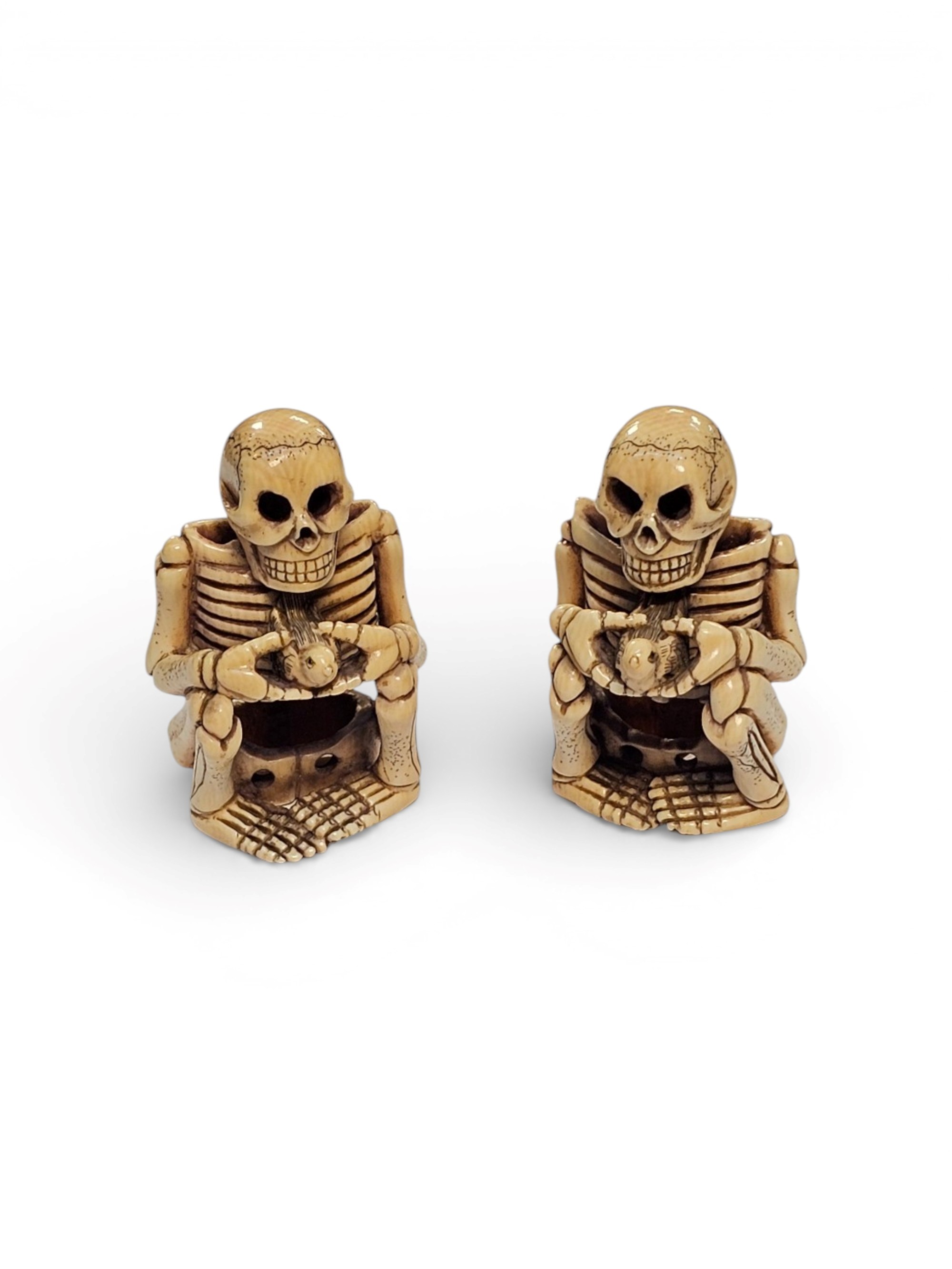 The two figures, probably intended as an allegorical pairing, are modelled with great anatomical rigour: the ribs, vertebrae and joints are noted, rendered with almost scientific fidelity, but at the same time with a delicacy that enhances their contemplative rather than macabre aspect. In stark contrast to the bony rigidity, the two figures have little birds placed between their hands. This juxtaposition between life and death, between transience and lightness, is an aspect often present in Japanese aesthetics and spirituality.