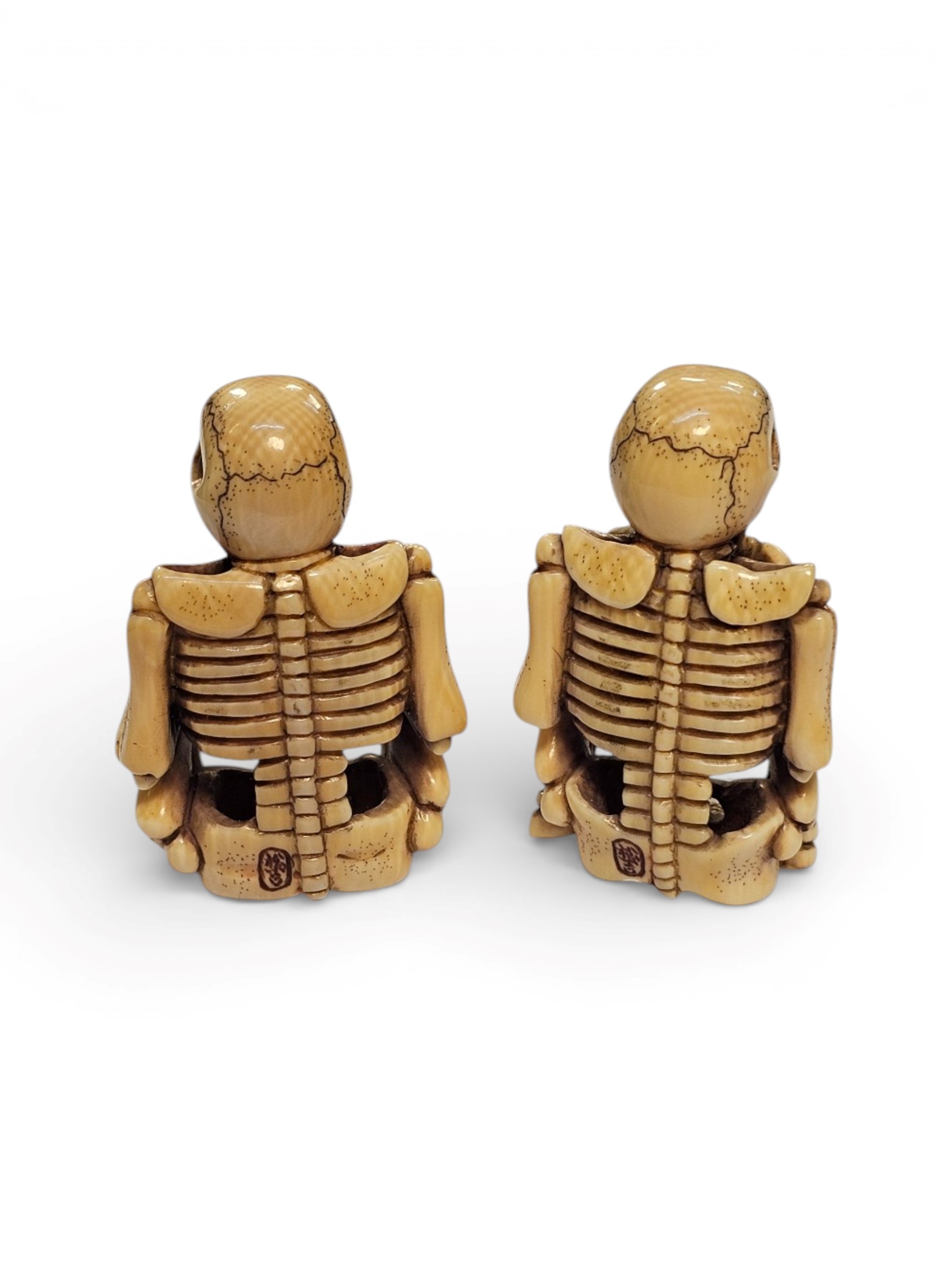 Antique pair of carved in elephant ivory skeletons (Elephas maximus Linnaeus, 1758 or Loxodonta africana Blumenbach, 1797) made in Japan with great artistry during the Meiji period (1868-1912).
