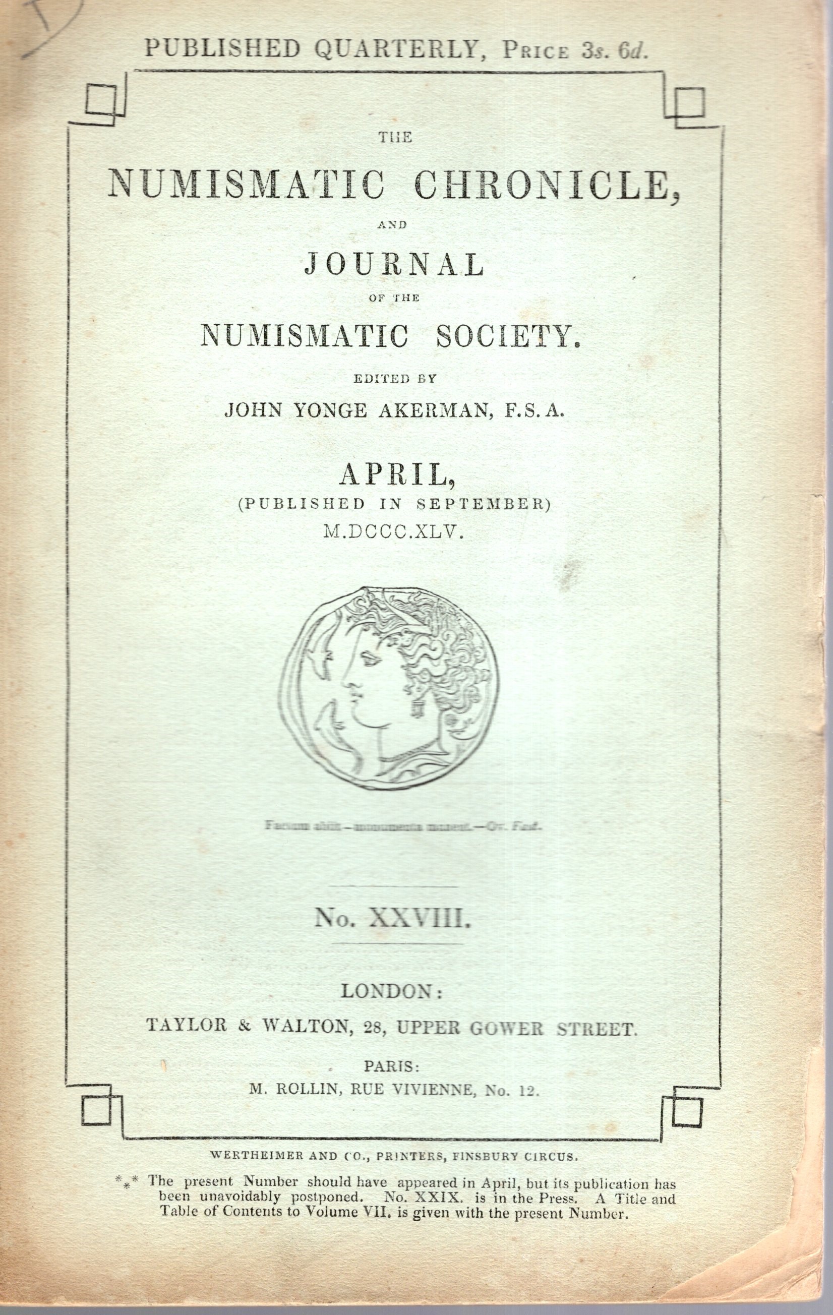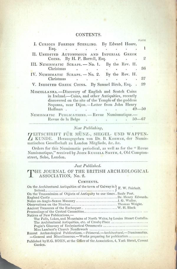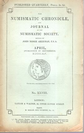 NUMISMATIC CHRONICLE - London, April, 1845. Pp 68. Legatura ed, sciupata, interno buono stato, molto raro.