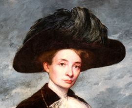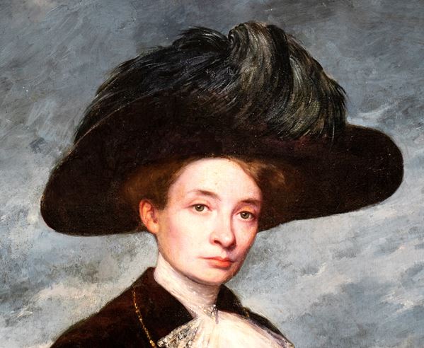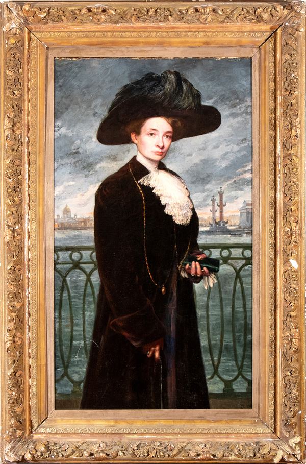 Portrait of a lady with a feathered hat and Venice in the background