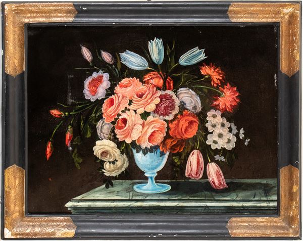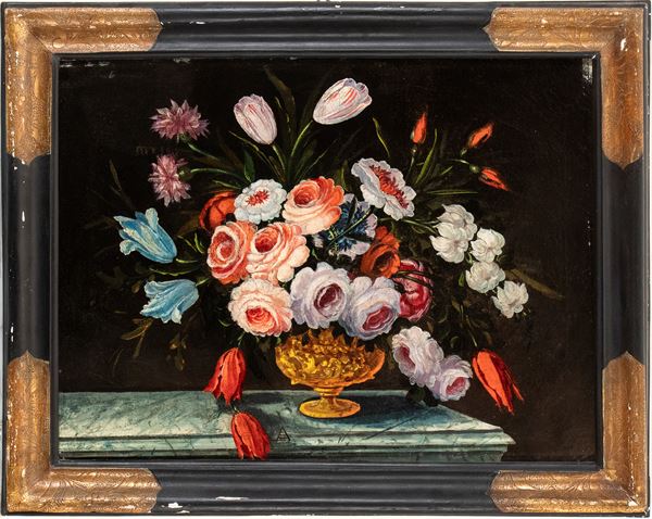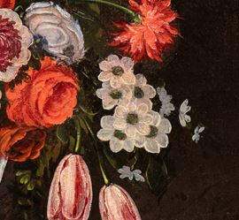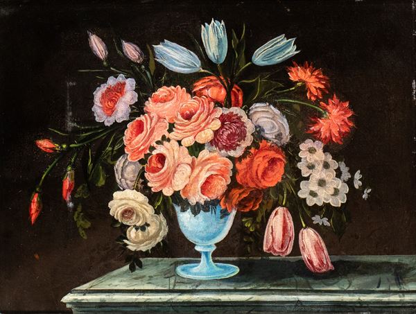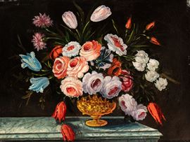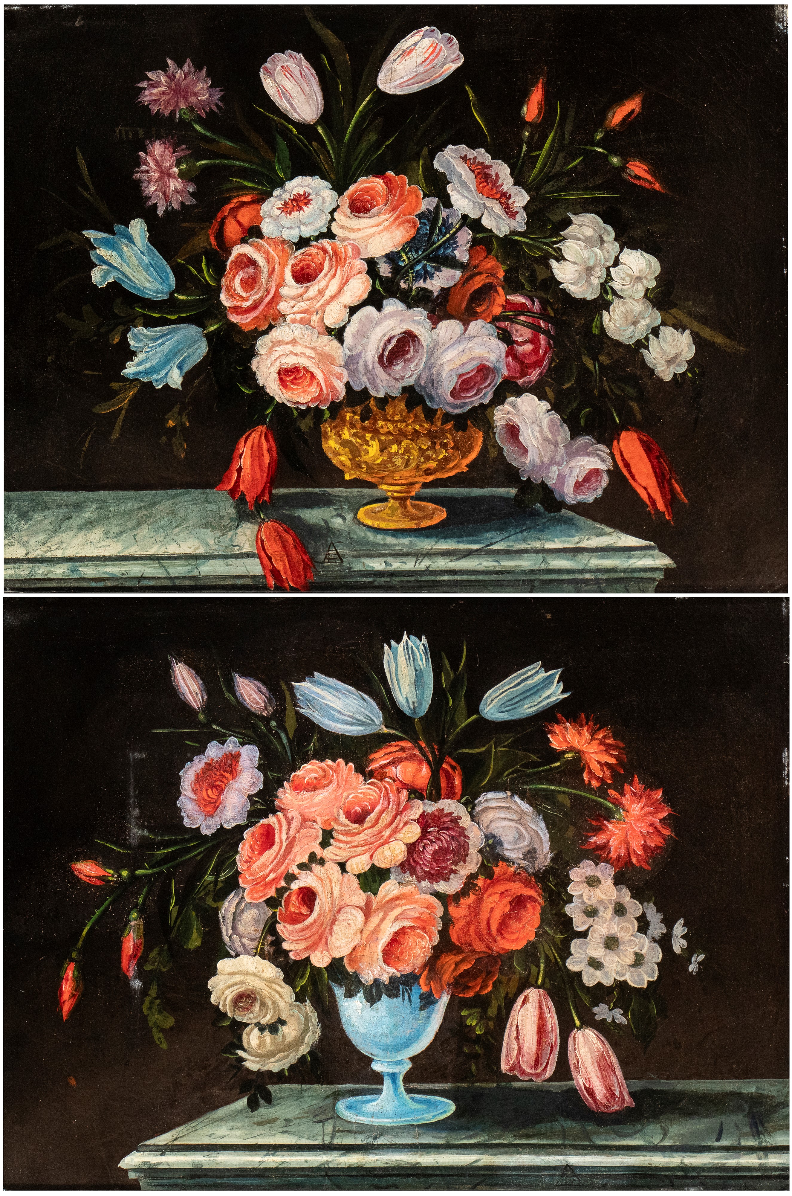 a) Bouquet of roses and tulips in a metal vase; b) Bouquet of roses and tulips in a glass vase. A pair of paintings