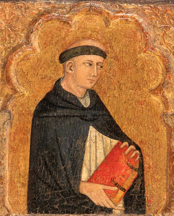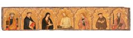 This high-quality panel, conceived as a predella with half-length saints, the Virgin and the Man of Sorrows beneath polylobed arches, has been attributed by Andrea De Marchi to the Anconitan painter Francesco di Antonio. Active in the late fourteenth century, the artist here reveals a synthesis of Orvietan models and Fabriano painting, with close stylistic ties to works such as his signed polyptych of 1393 in the Pushkin Museum.