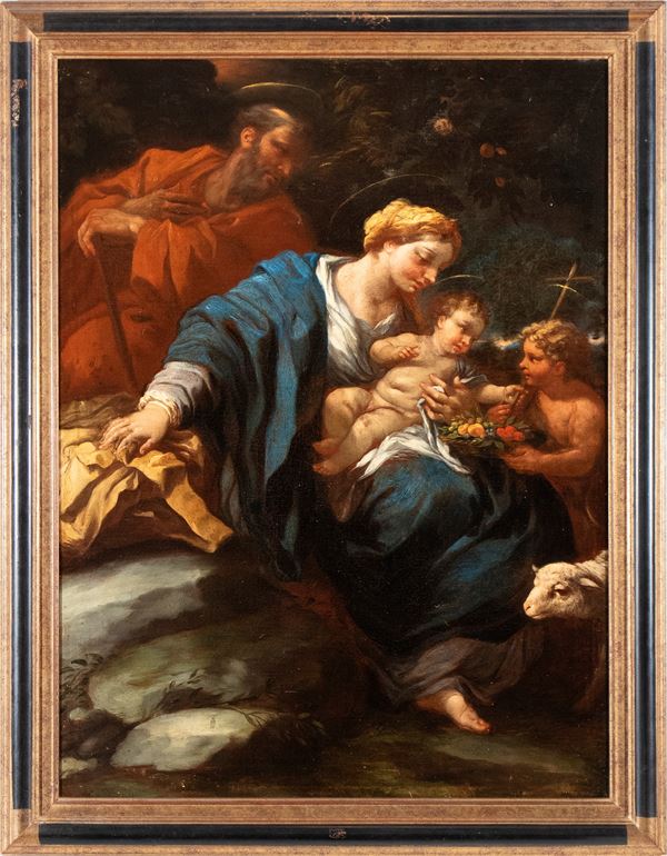 Previously unpublished, this painting has been attributed to Luca Giordano by Professor Nicola Spinosa, who dates it to the late 1660s or early 1670s. The Holy Family is depicted as an intimate domestic scene, animated by tender exchanges among the figures and enriched by refined still-life details. The luminous palette, balanced composition and softened emotional tone relate closely to Giordano’s mature production of the period. Stylistic comparisons may be drawn with works such as the Christ Deposed in Venice and the signed Madonna of the Rosary (1672) in Crispano. The painting exemplifies Giordano’s synthesis of naturalism and neo-Venetian classicism.