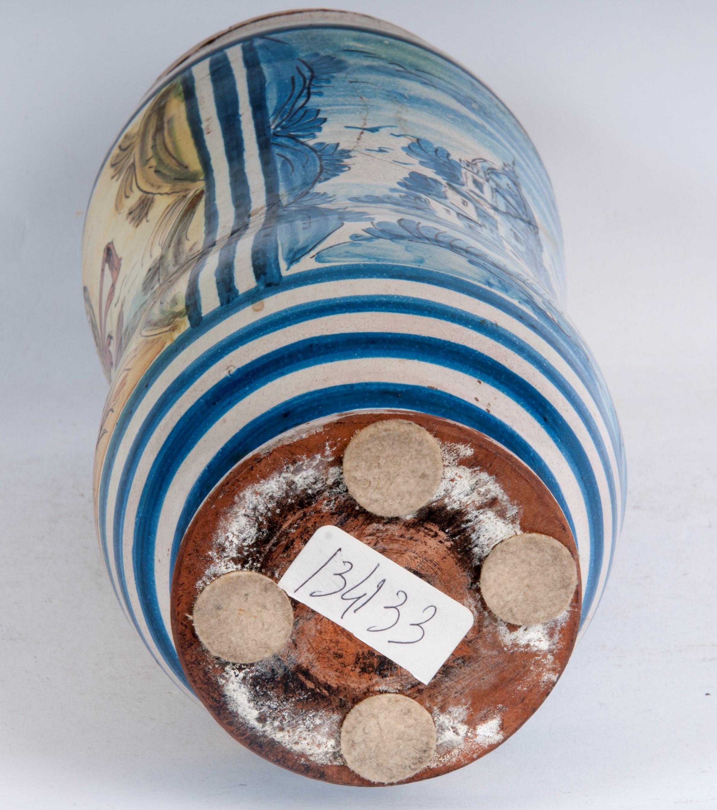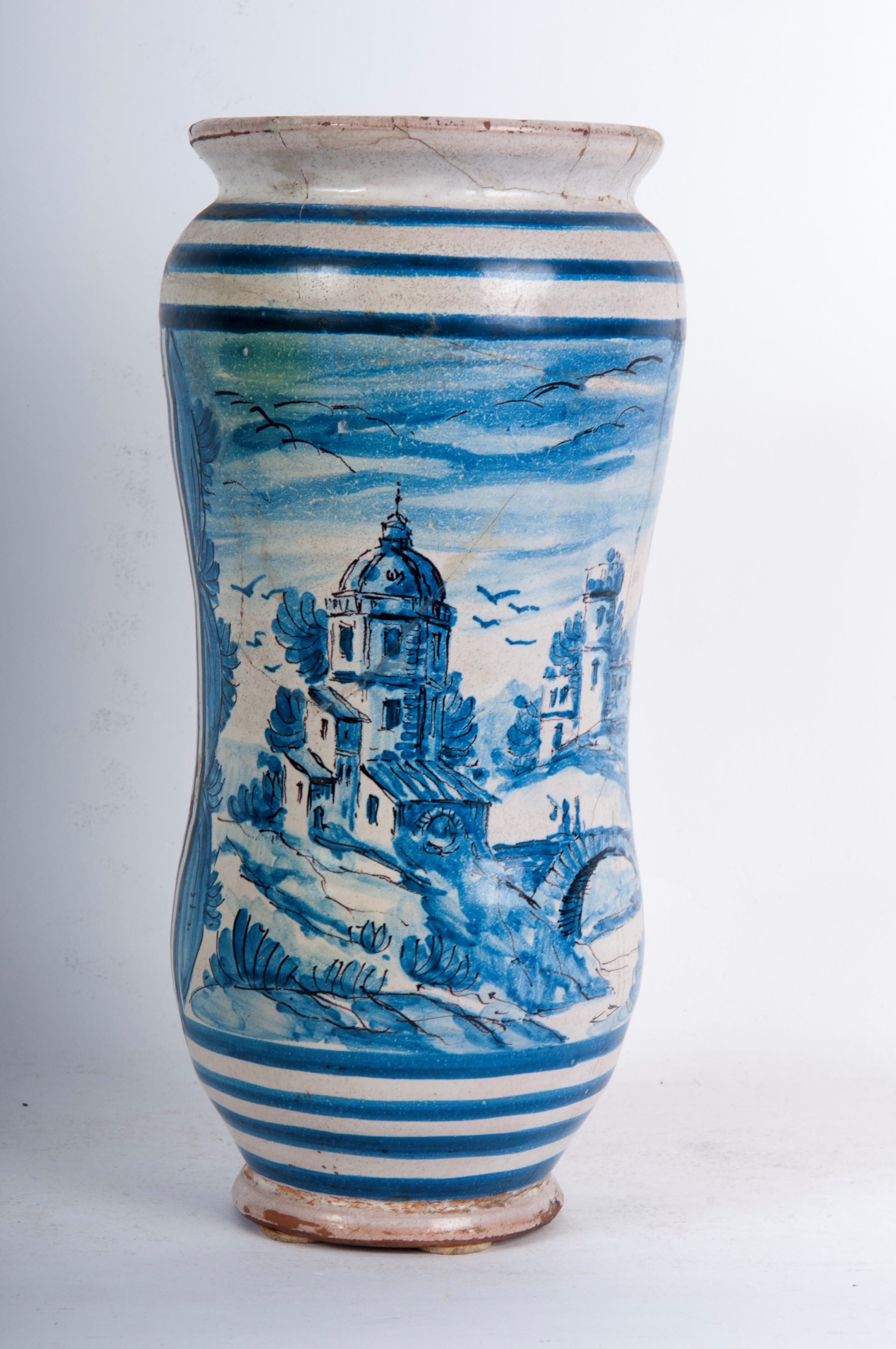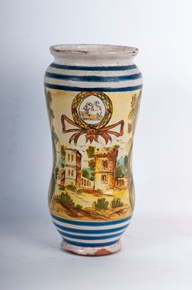 Body tapered in the center with an everted upper rim and a disc-shaped base. One side features a landscape scene in blue on a white background within a frame; the opposite side features ochre buildings on a yellow background and a coat of arms with a lion. Southern workshop, second half of the 18th century.