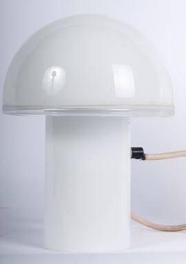 Featuring a distinctive mushroom shape, this lamp is made of opaline blown Murano glass, with a white finish and a transparent crystal glass rim. Designed by Luciano Vistosi, it is produced by Artemide.