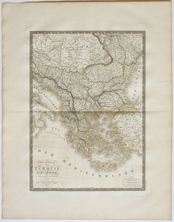 Acquaforte e bulino, 690 x 535 mm (foglio). Prima edizione. Tratta da "Atlas universel". Sopra il cartiglio timbro a secco del autore "CARTE ENCYPROTIPE | DU FONDS | DE L’AUTEUR e iniziali AB" (Lugt 5271).