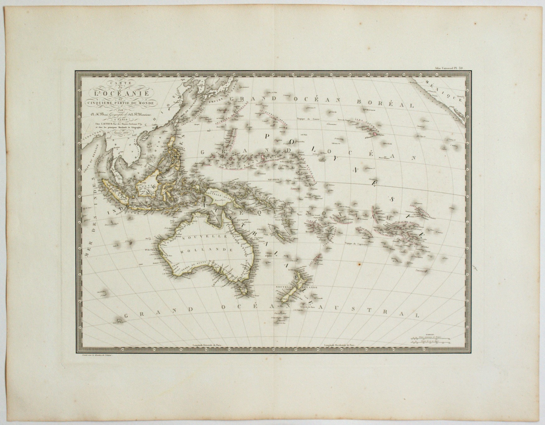 Acquaforte e bulino, 535 x 690 mm (foglio). Prima edizione. Tratta dal "Atlas Universel". Vicino al cartiglio timbro a secco del autore "CARTE ENCYPROTIPE | DU FONDS | DE L’AUTEUR e iniziali AB" (Lugt 5271).