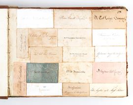 Collezione di 4 volumi in 4 ° oblungo contenente una collezione di più di 1500 biglietti da visita italiani e stranieri incollati su carta e distribuiti in 4 volumi in 4° grande con legatura coeva in mz pelle. Figurano i nomi di Horace Vernet, Carl Vernet, il cavalier Valadier, i principi Torlonia, Orsini, Aldobrandini, Albani, Altieri.