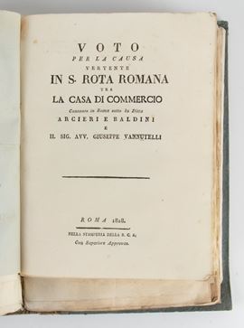 Volume in folio piccolo composto da più di sessanta dissertazioni a stampa e manoscritte, databili tra la metà del XVIII e l’inizio del XIX secolo. Se ne evidenziano alcune: Dissertatio: De centro gravitatis, manoscritto di pp. 24; numerosi documenti, bandi della Delegazione di Fermo; Voto per la causa vertente in S. Rota romana tra la casa di commercio Arcieri e Baldini e il signor avv. Giuseppe Vannutelli.